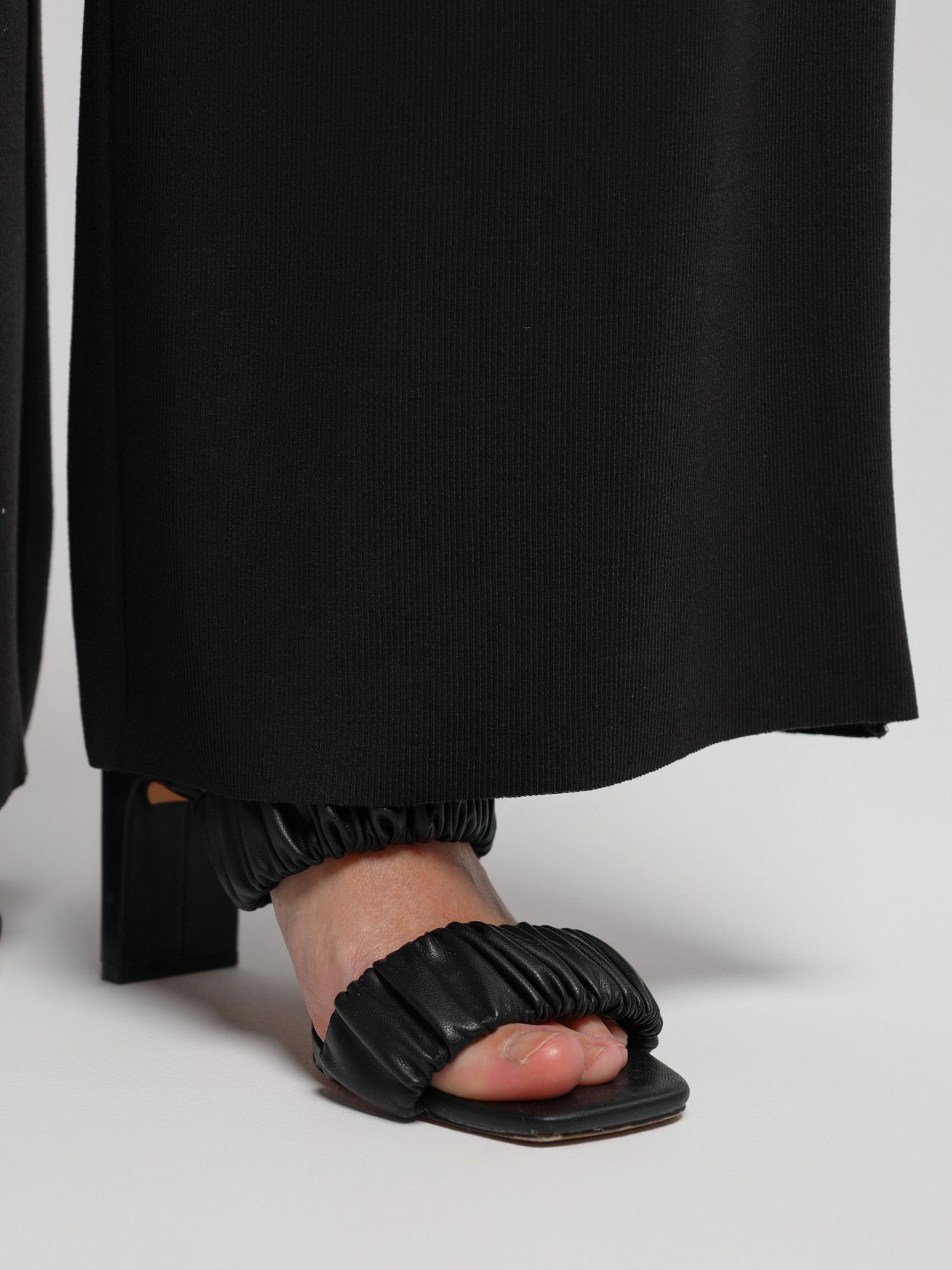 Брюки женские из гладкокрашеного фактурного трикотажного полотна в «рубчик», свободного кроя, без подгибки нижних срезов, с широкой эластичной тесьмой по талии. Изделие выполнено из неосыпающейся ткани, что дает возможность регулировать длину самостоятельно.