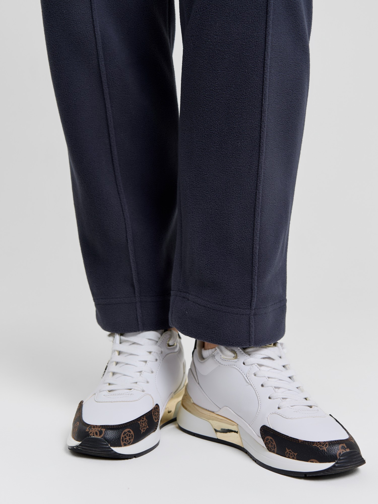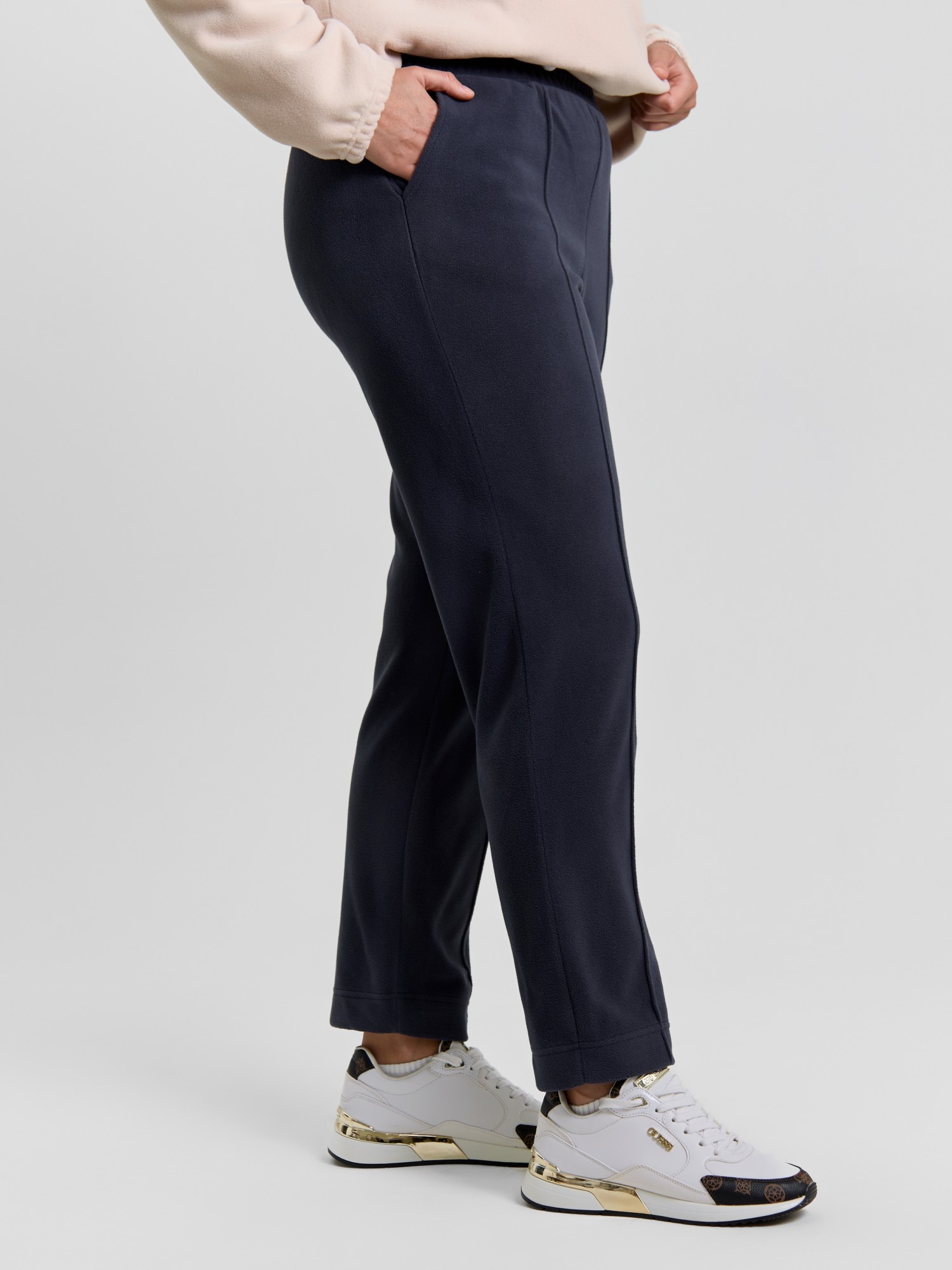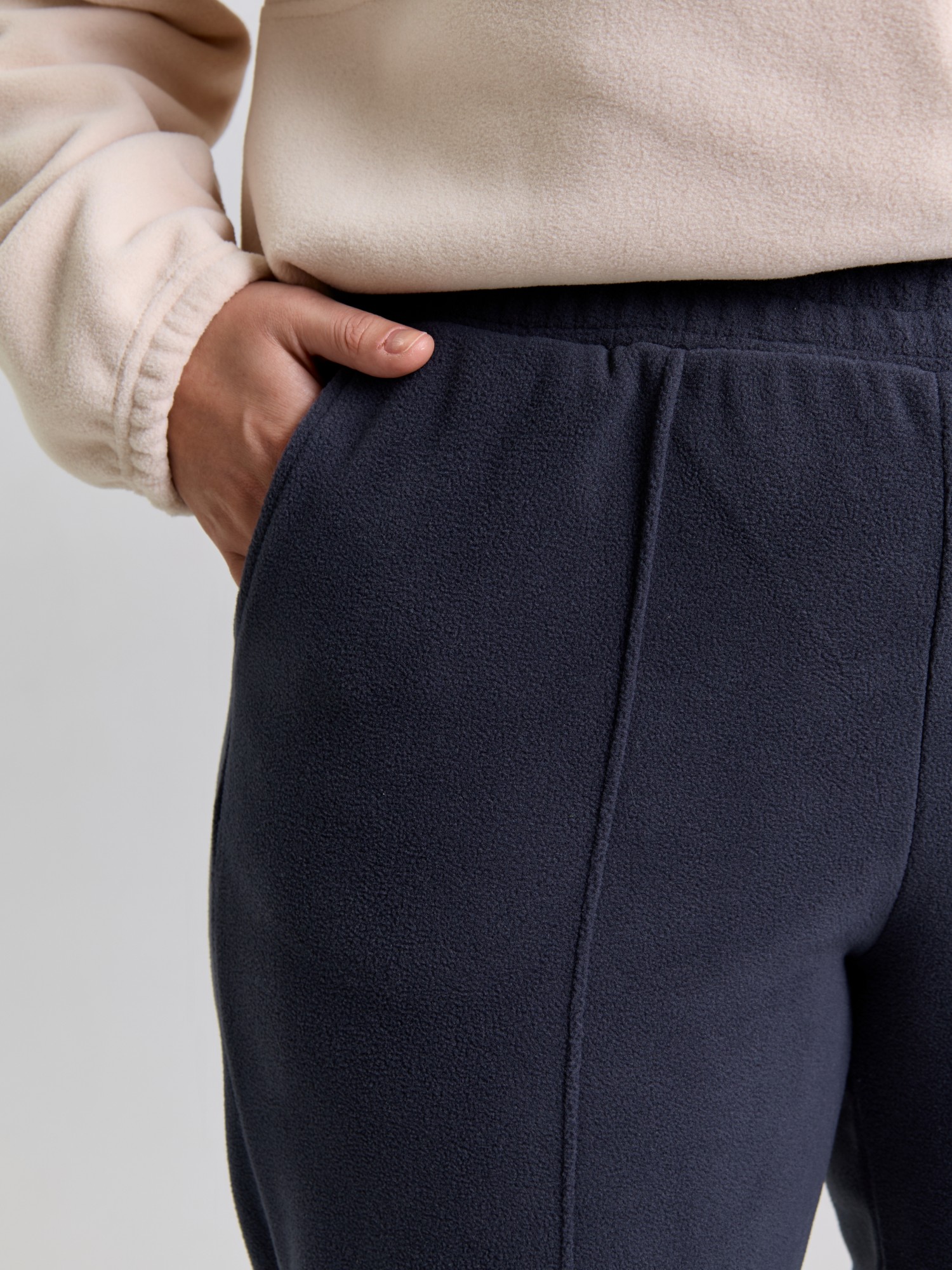 Брюки женские из гладкокрашенного трикотажного полотна «флис», длинные, полуприлегающего силуэта, на притачном поясе с эластичной тесьмой внутри и карманами в боковых швах. Передние половины застрочены по центральным линиям, низ обработан широкой подгибкой.