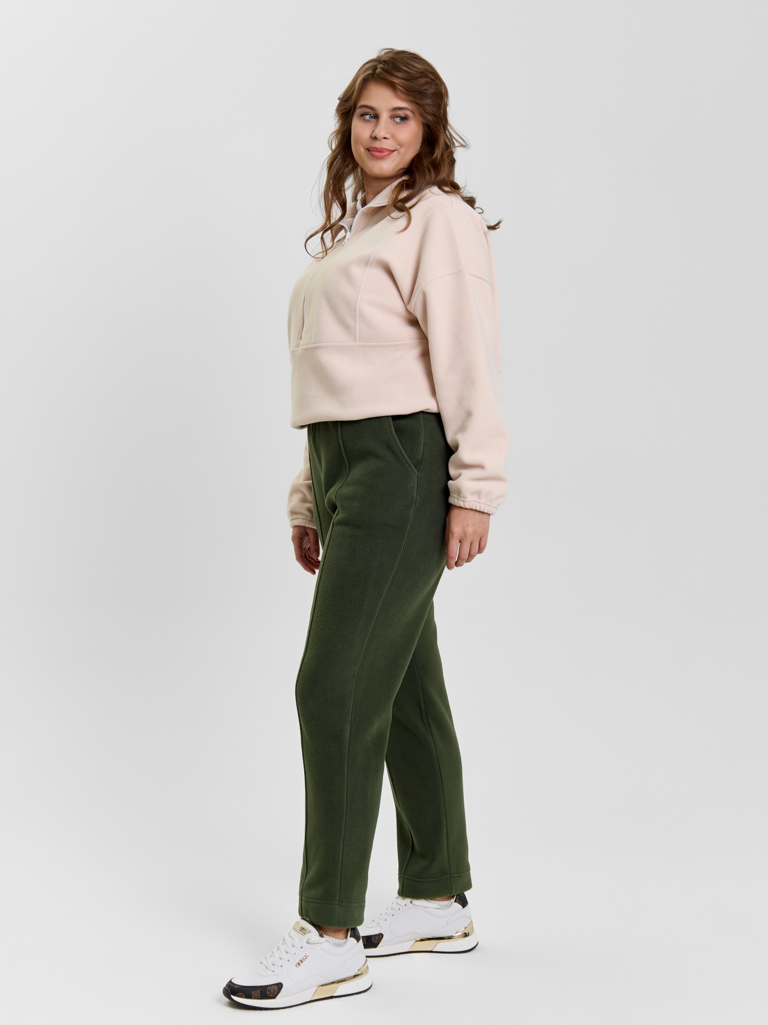 Брюки женские из гладкокрашенного трикотажного полотна «флис», длинные, полуприлегающего силуэта, на притачном поясе с эластичной тесьмой внутри и карманами в боковых швах. Передние половины застрочены по центральным линиям, низ обработан широкой подгибкой.