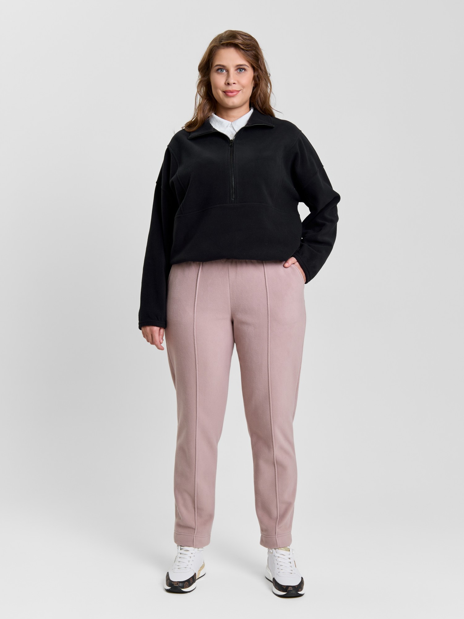 Брюки женские из гладкокрашенного трикотажного полотна «флис», длинные, полуприлегающего силуэта, на притачном поясе с эластичной тесьмой внутри и карманами в боковых швах. Передние половины застрочены по центральным линиям, низ обработан широкой подгибкой.