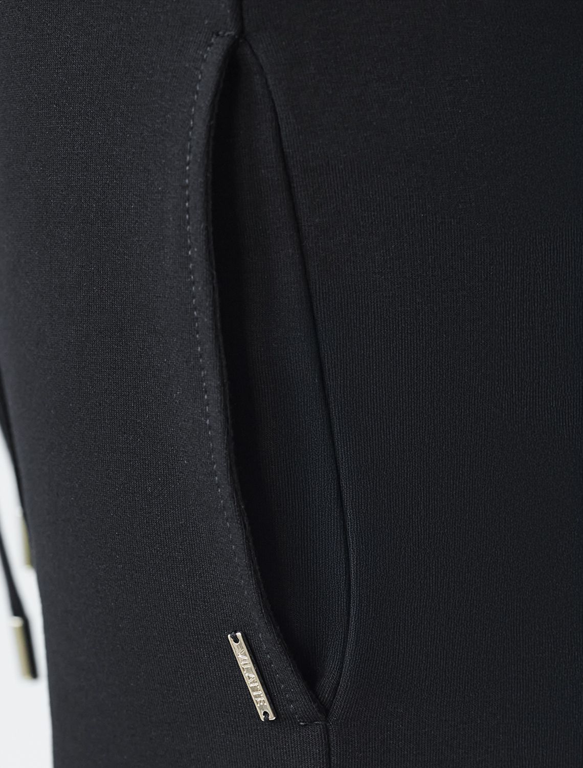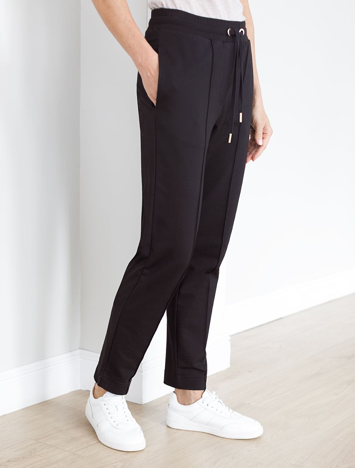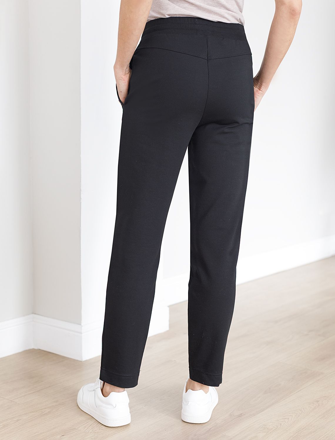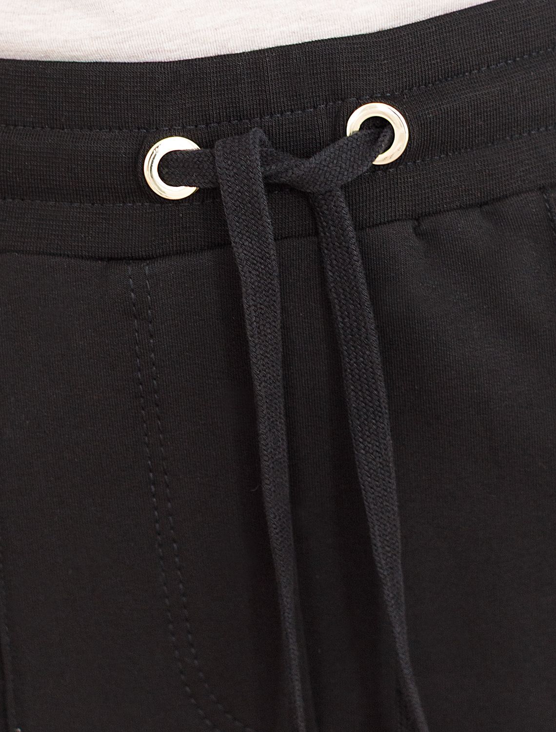 Стильные джоггеры черного цветас застроченными стрелками из пермиального футера с эластаном – это универсальный выбор для повседневго образа. Изготовленные из натуральной ткани, они обладают мягкостью и комфортом. Актуальная модель с завышенной талией подчеркивает фигуру, вытягивает силуэт и визуально удлиняет ноги. Штаны подходят для любого роста благодаря универсальной длине. Базовые брюки скроют недостатки фигуры и станут отличным решением для девушек и женщин любого размера. Широкий ряд размеров позволяет выбрать оптимальный вариант для любой комплекции. Благодаря удобной эластичной резинке, пояс не сдавливает и не доставляет дискомфорта при движении. Качественный материал отличается прочностью и долговечностью: брюки хорошо держат форму и сохраняют первоначальный внешний вид даже после многочисленных стирок. Наличие эластана в составе гарантирует устойчивость к деформациям и легкость ухода. Практичные карманы по бокам позволяют удобно хранить необходимые мелочи всегда под рукой. Лаконичный дизайн дополняется деталями: металлический наконечник украшает край шнурка, что добавляет изделию современности и делает его более выразительным, а на кармане рассположе небольший логотип бренда.