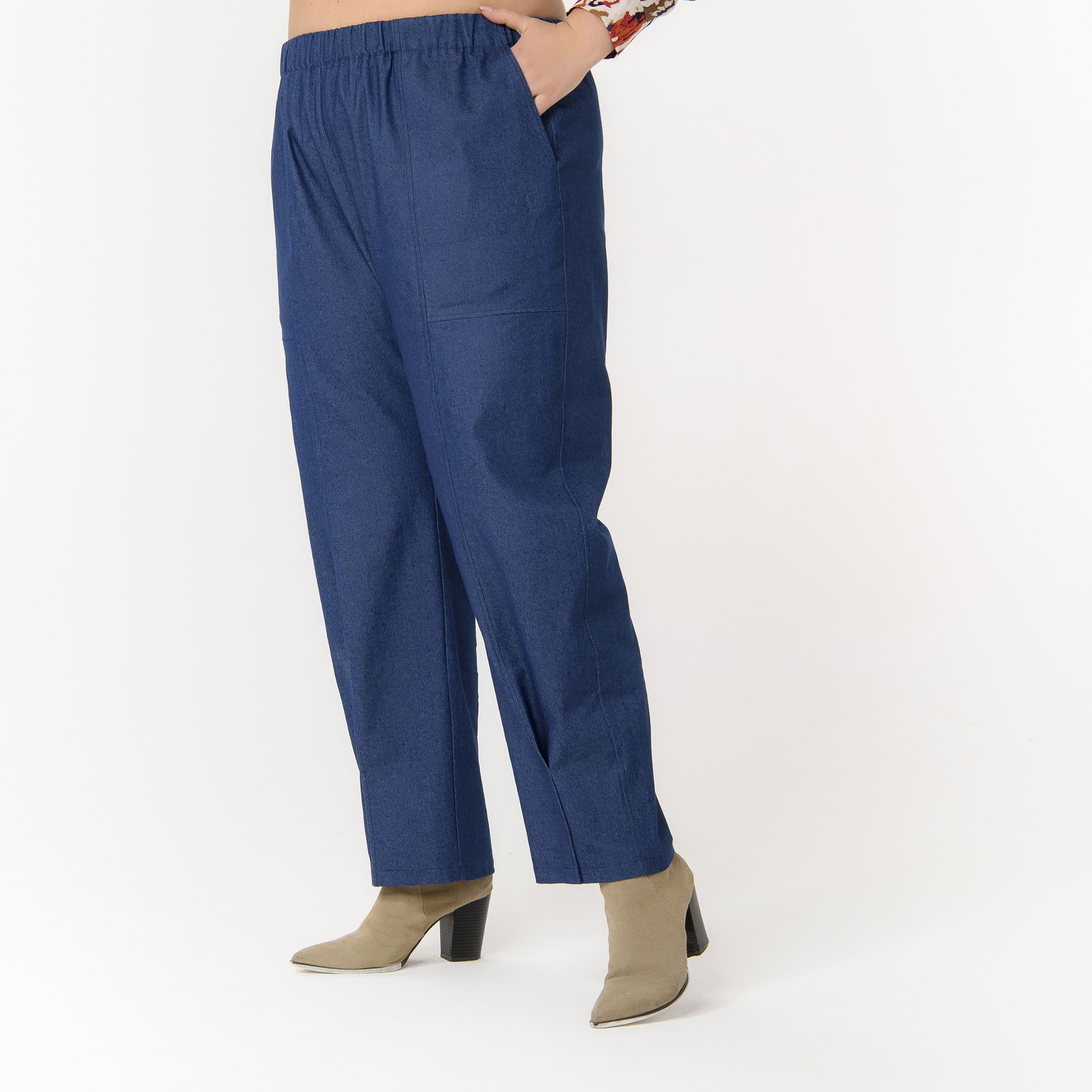Прямые брюки из денима с вертикальными швами по передней половинке. По низу передних половинок застрочены складки, визуально заужающие брюки и создающие эффект брюк -"банан".