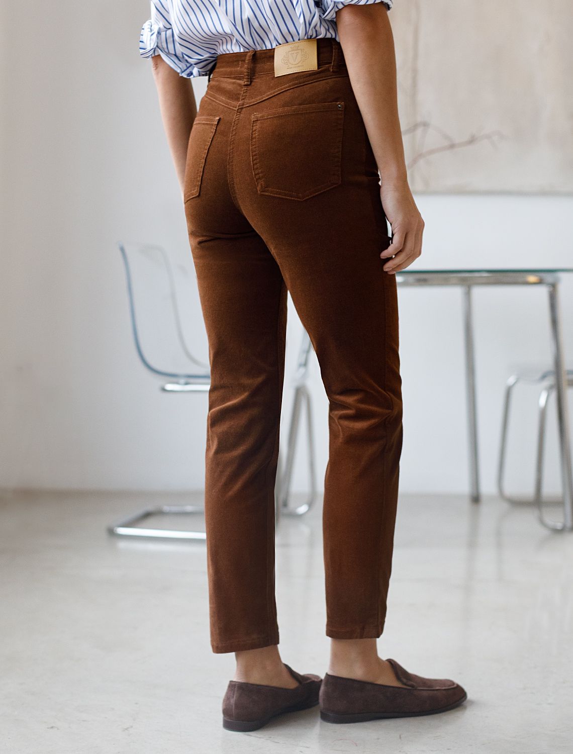 Брюки скроют недостатки фигуры, вытягивают силуэт и удлиняют ноги, благодаря завышенной талии. Пять карманов, как у джинс, добавляют функциональности, а высококачественная фурнитура гарантирует надёжность. Актуальная однотонная расцветка позволит легко комбинировать штаны с другими вещами из гардероба. Брюки джинсы хорошо комбинируется с вязаным трикотажем, блузками и денимом. Как альтернатива классическим брюкам, в нестрогий офисный дресс-код.