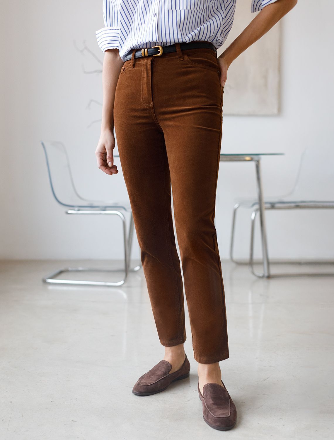 Вельветовые брюки женские зауженные в фасоне мом слим станут идеальным дополнением к теплому образу осенью и зимой. Они выполнены из мягкой хлопковой эластичной ткани, которая обеспечивает комфорт и защищает от холода.
