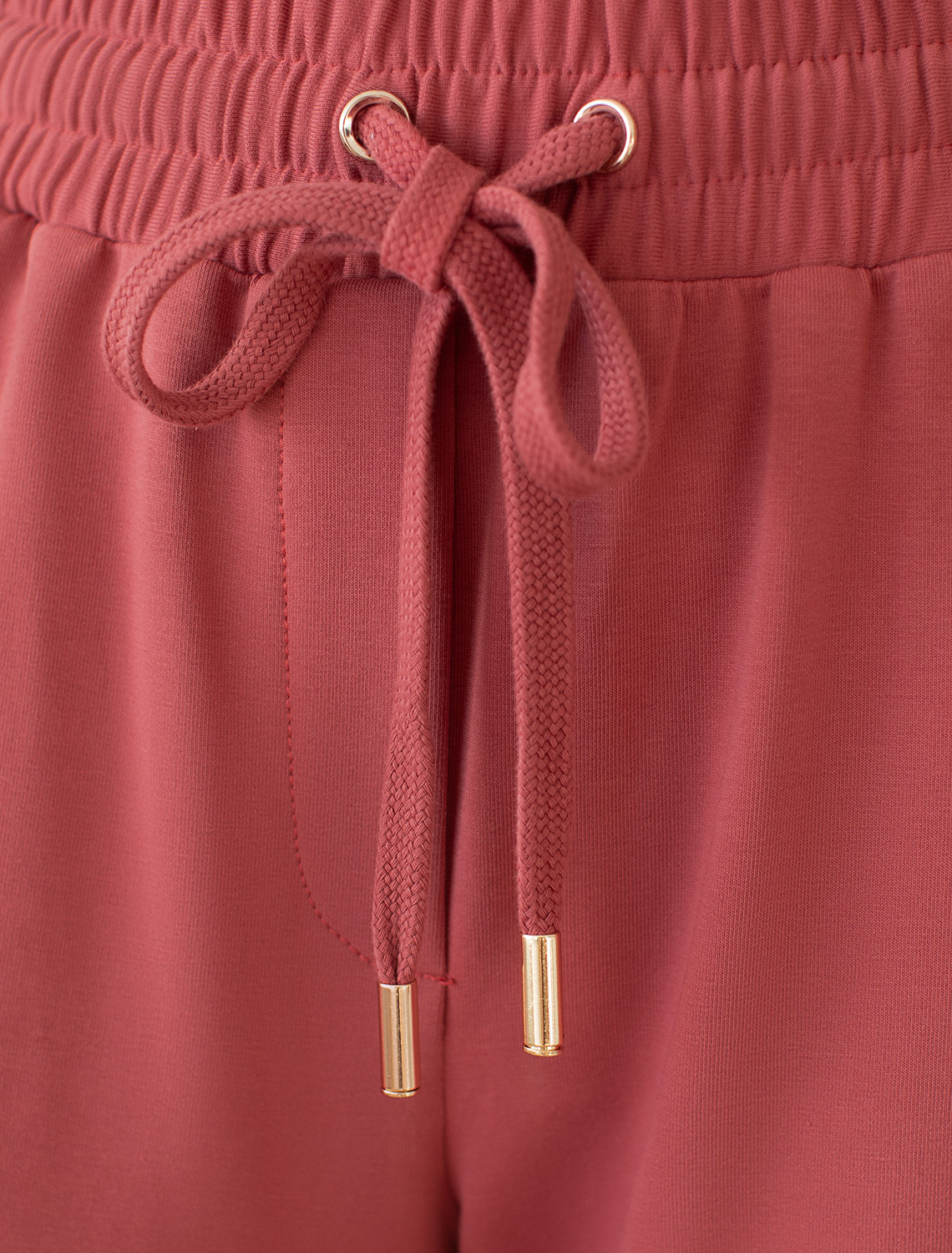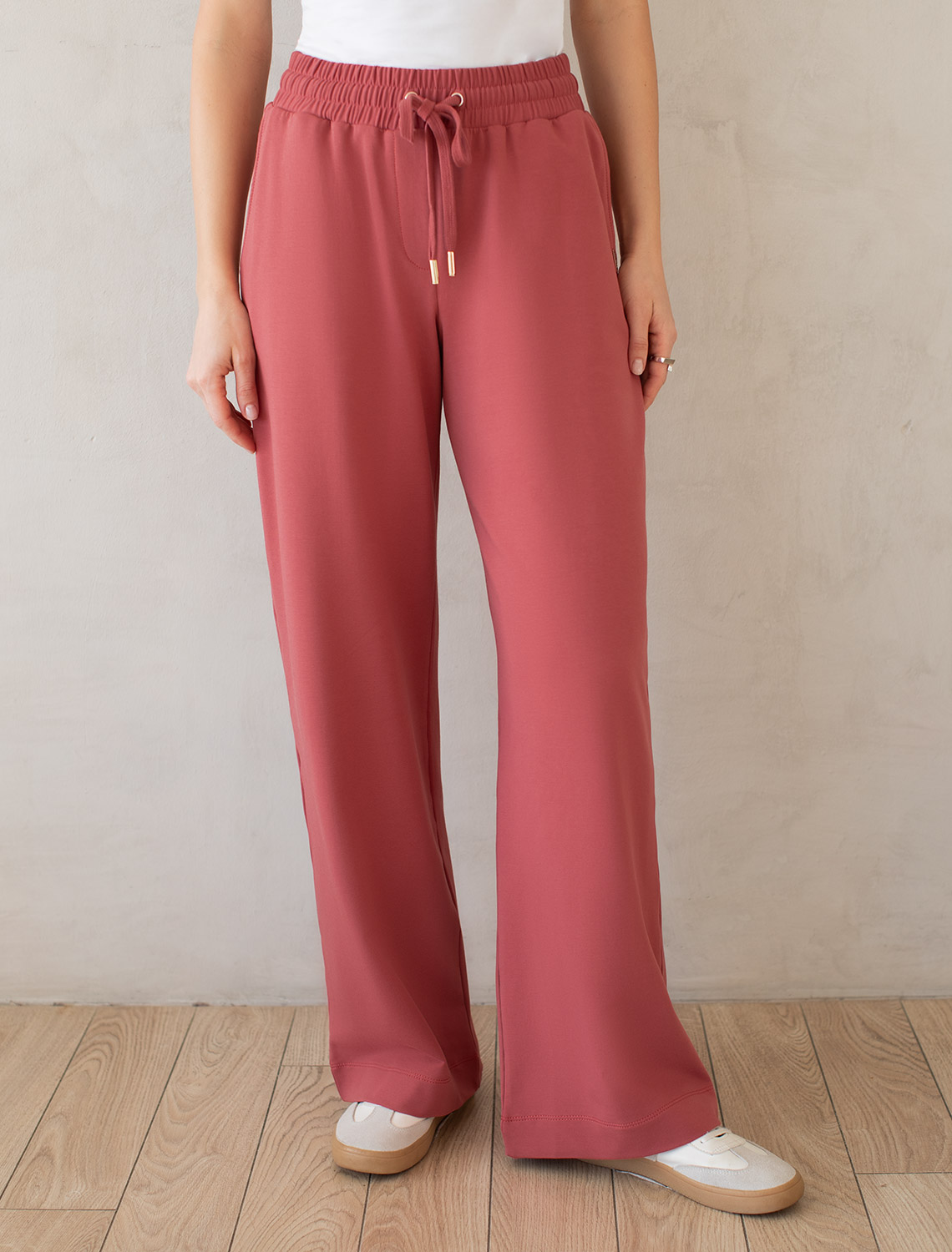 Брюки выполнены из футера двухнитки с эластаном. Модель прямого кроя дополнена боковыми карманами и одним задним карманом. Пояс выполнен из эластичного трикотажа в рубчик. В пояс вставлен плоский хлопковый шнур в тон изделия с золотистыми наконечниками. Изделие дополнено металлическим логотипом бренда. Сочетается в костюме с жакетом D49.078, джемпером D49.079, D49.080 и футболкой D49.081 терракота