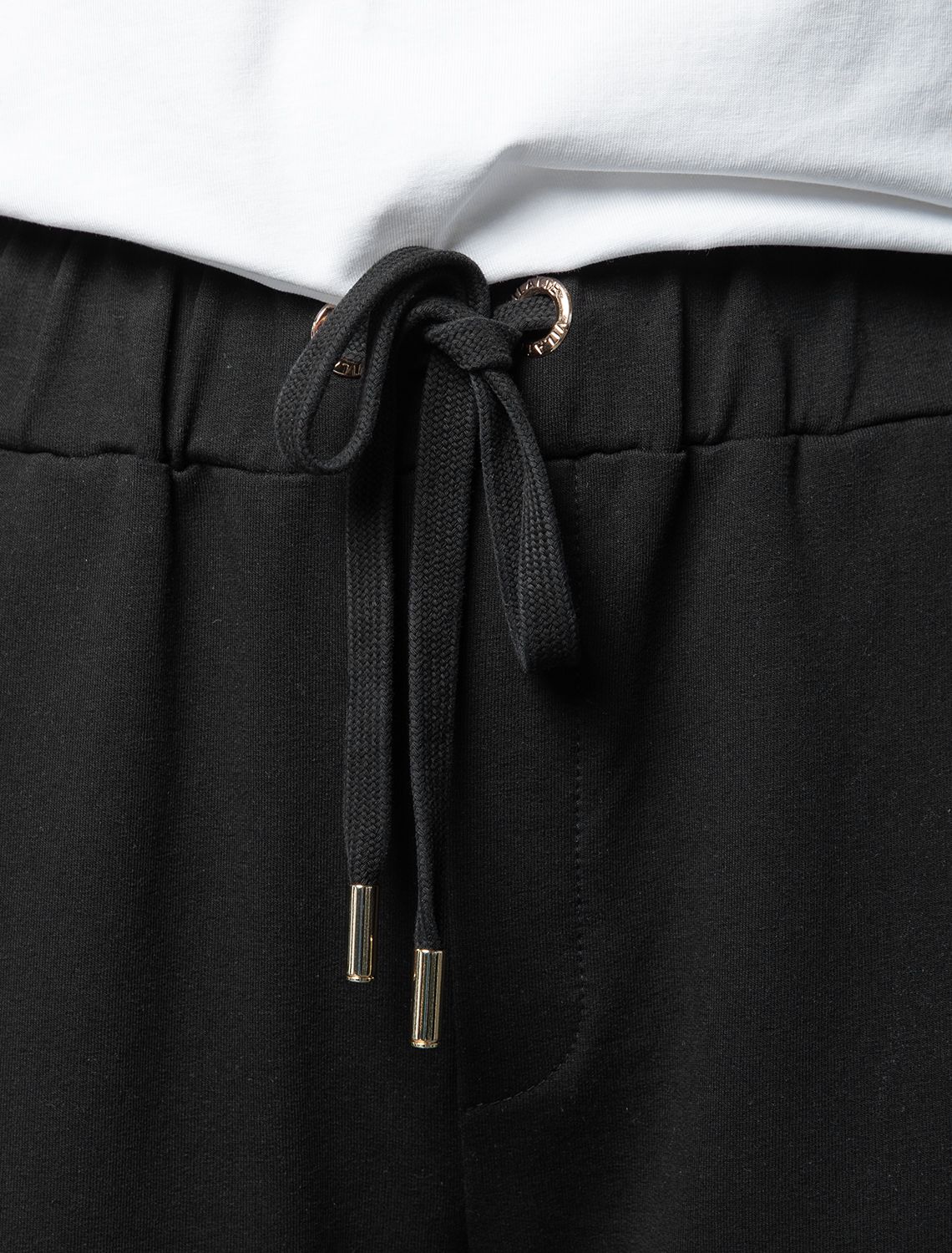 Черные брюки джогерры выполнены из эластичного футера двухнитки. Модель дополнена двумя карманами и поясом с регулируемым шнурком. В завершённый образ возьмите свитшот D49.945, D49.948 или свободное худи.