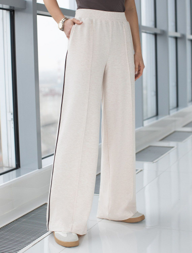 Брюки выполнены из футера двухнитки с эластаном. Модель зауженная к низу дополнена карманами и эластичным поясом с фактурой в рубчик. В пояс вставлен плоский хлопковый шнур в тон изделия с серебристыми наконечниками. Изделие дополнено металлическим логотипом бренда. Сочетается в костюме с жакетом D49.078, джемпером D49.079, D49.080 и футболкой D49.081