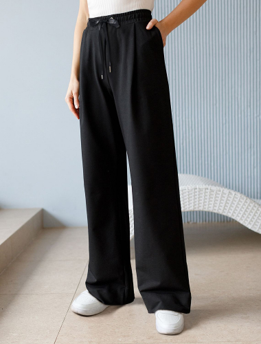 Брюки выполнены из футера двухнитки с эластаном. Модель прямого кроя дополнена боковыми карманами и одним задним карманом. Пояс выполнен из эластичного трикотажа в рубчик. В пояс вставлен плоский хлопковый шнур в тон изделия с серебристыми наконечниками. Изделие дополнено металлическим логотипом бренда. Сочетается в костюме с жакетом D49.078, джемпером D49.079, D49.080 и футболкой D49.081