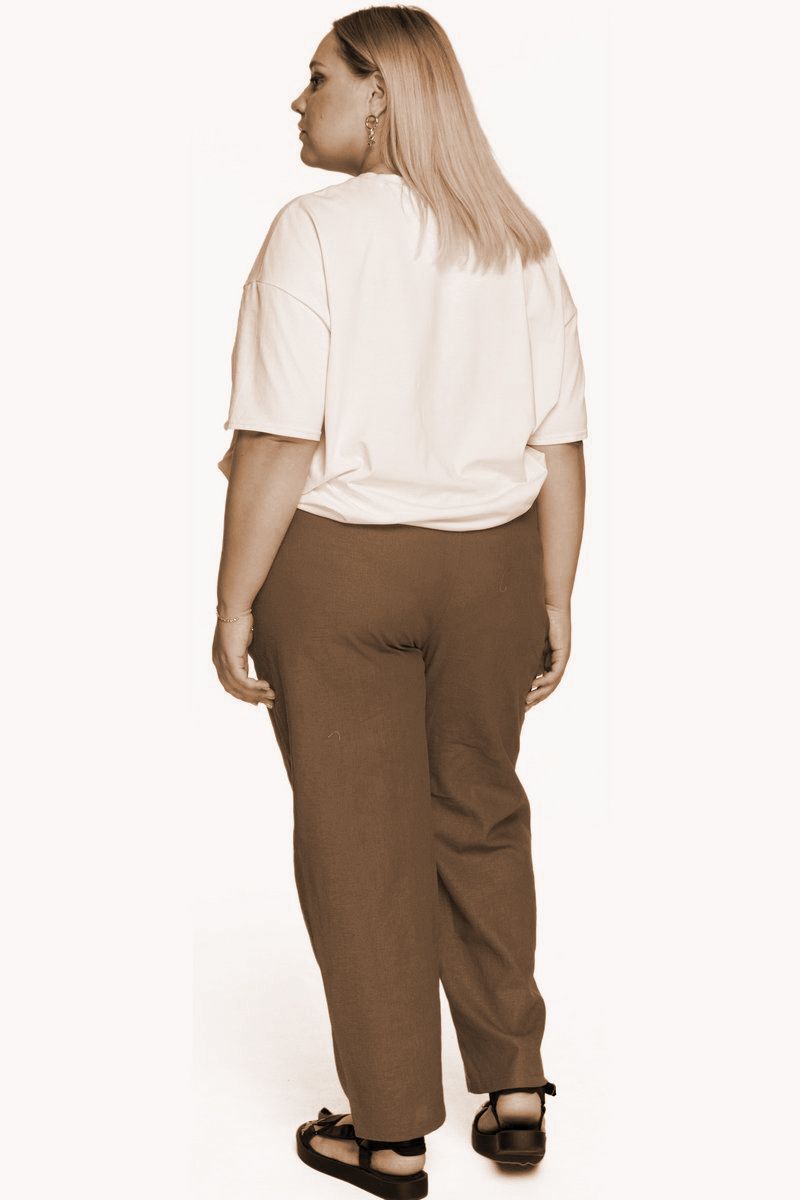 Прямые брюки с вертикальными швами по передней половинке. По низу передних половинок застрочены складки, визуально заужающие брюки и создающие эффект брюк-"банан".