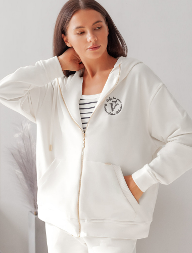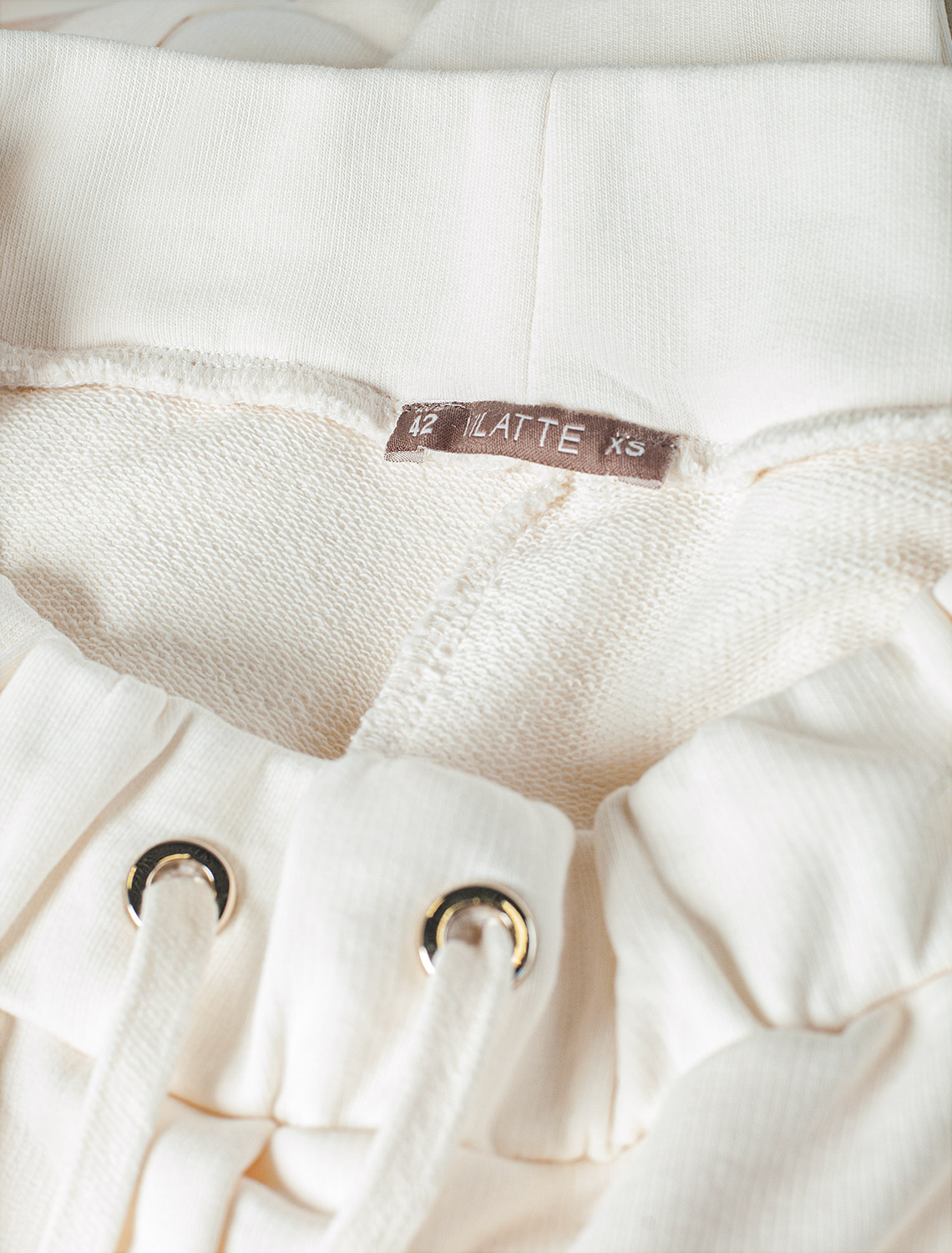 Брюки выполнены из премиального футера трехнитки без начеса. Модель дополнена эластичным поясом на резинке и хлопковым шнурком с золотистой фурнитурой. По бокам два кармана. Наличие эластана в составе гарантирует формоустойчивость и износостойкость изделия. Изделие сочетается в костюме с худи D49.051 молочный