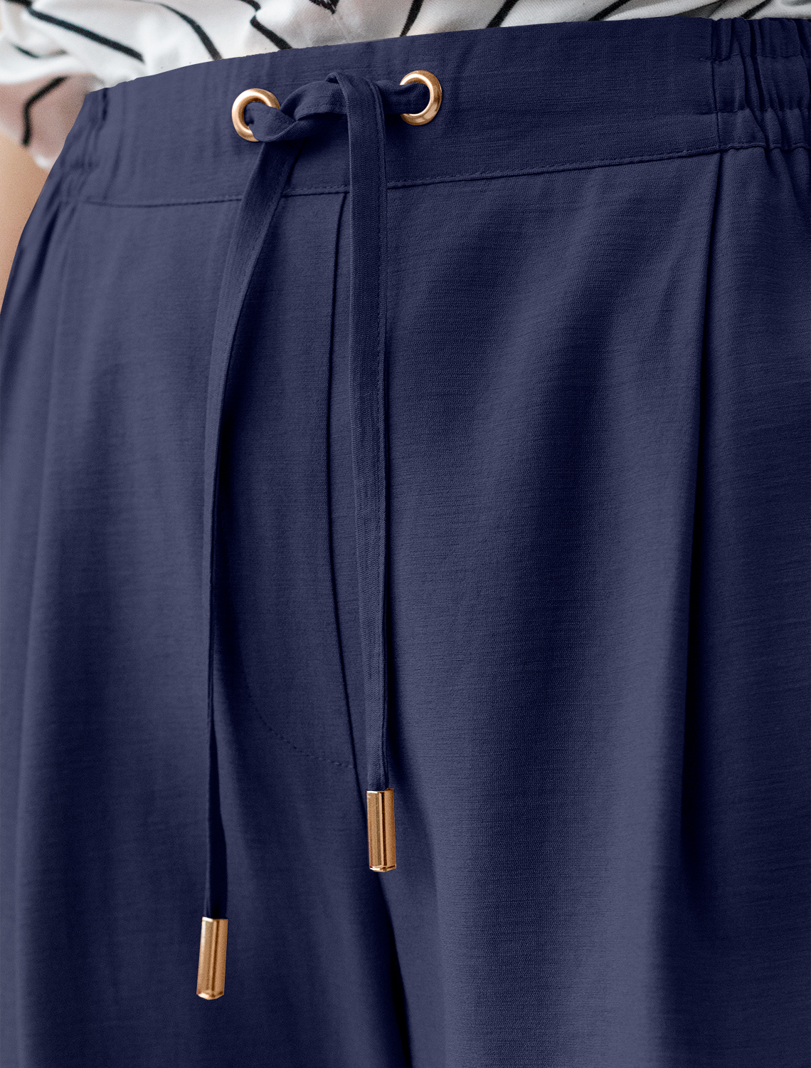 Брюки выполнены из плотного лиоцелла. Модель дополнена карманами и поясом с эластичной резинкой и регулируемым шнурком с золотистой фурнитурой. Ткань изделия отлично держит форму, плавно драпируется и не просвечивает. В теплое время года приятно охлаждает кожу. Добавление синтетических волокон в составе изделия, предотвращает сминаемостьи поддерживает формоустойчивость. Брюки сочетаются в костюме с топом D23.063 и блузкой D29.266, D29.267 и жилетом D27.002 темно-синий