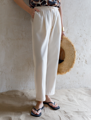 Брюки выполнены из плотного лиоцелла. Модель дополнена карманами и поясом с эластичной резинкой и регулируемым шнурком с золотистой фурнитурой. Ткань изделия отлично держит форму, плавно драпируется и не просвечивает. В теплое время года приятно охлаждает кожу. Добавление синтетических волокон в составе изделия, предотвращает сминаемостьи поддерживает формоустойчивость. Брюки сочетаются в костюме с топом D23.063 и блузкой D29.266, D29.267 и жилетом D27.002