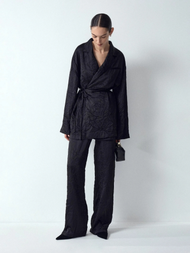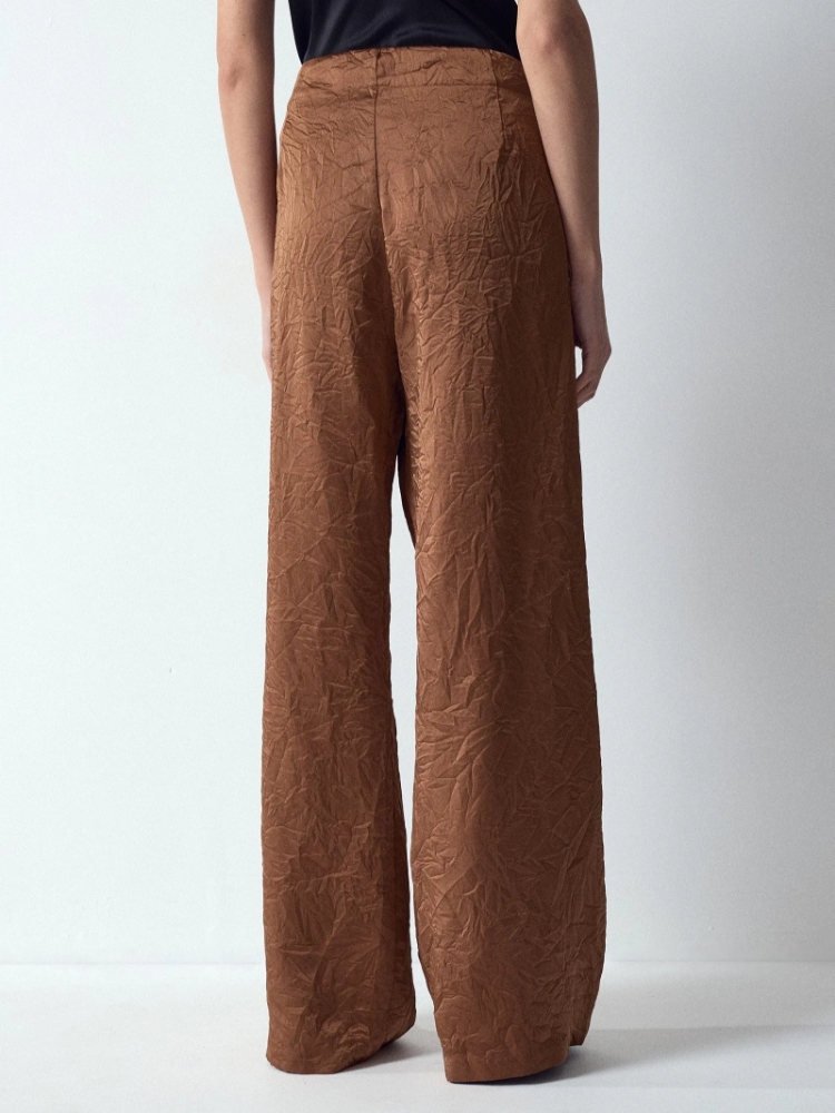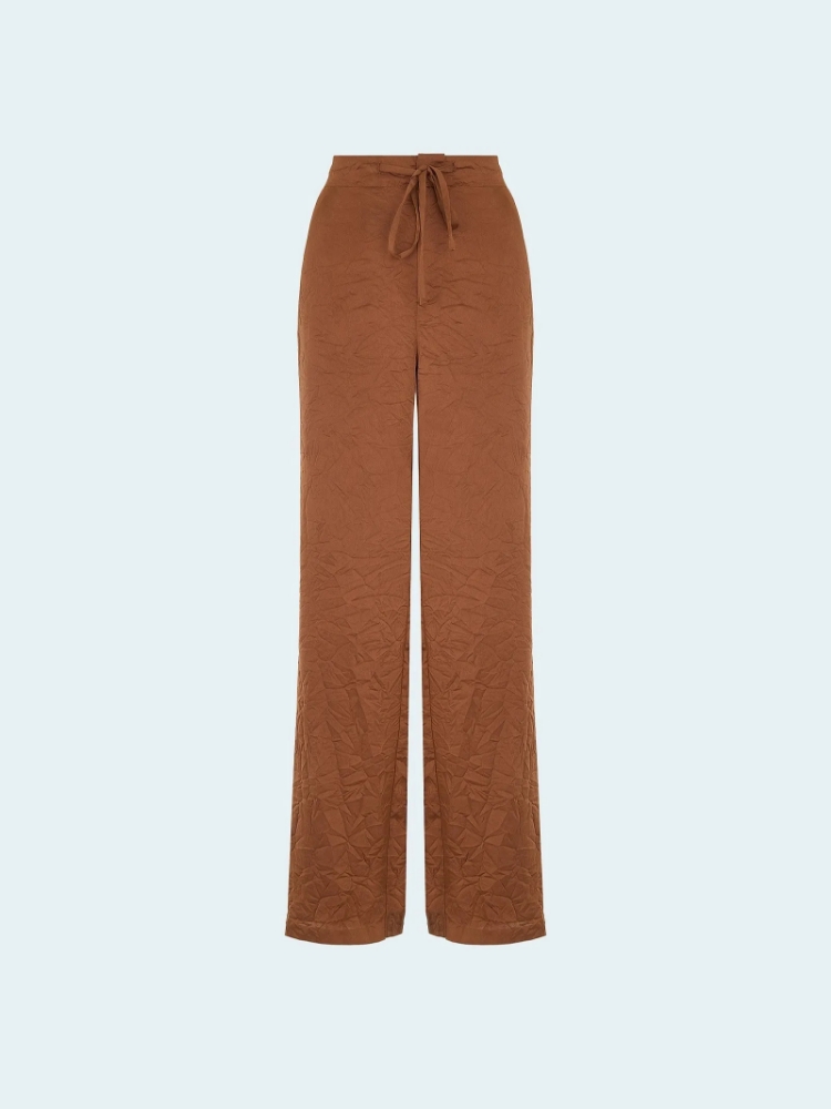 Золотисто-коричневые брюки из гладкого материала с жатым эффектом создадут непринуждённый образ для вечеринки или выходного дня. Застёгиваются на молнию и дополнены завязкой в талии, что позволяет подогнать вещь под свои параметры парой движений. Лучшее сочетание — с кимоно из комплекта