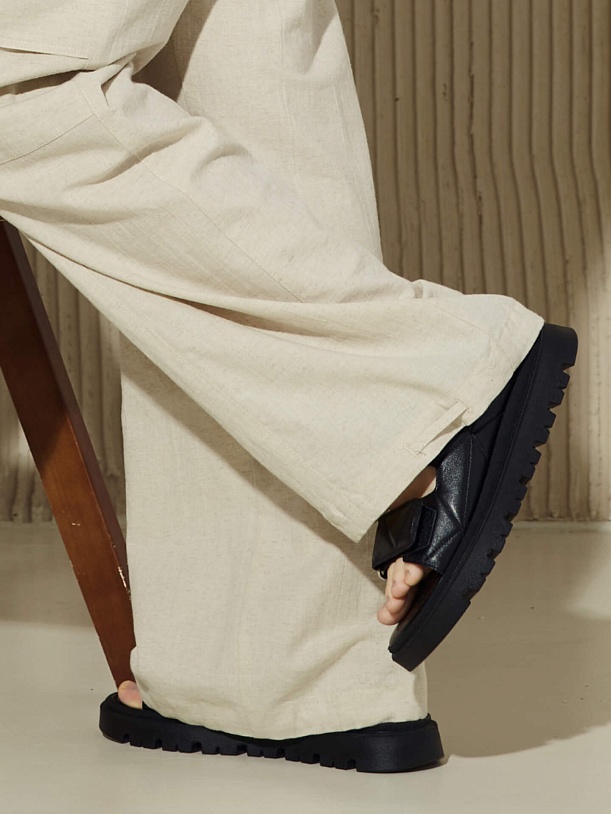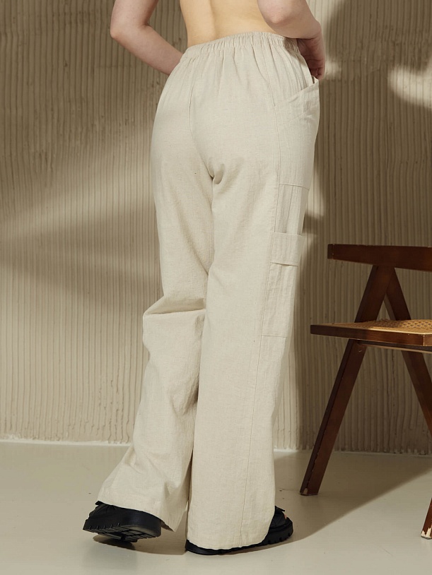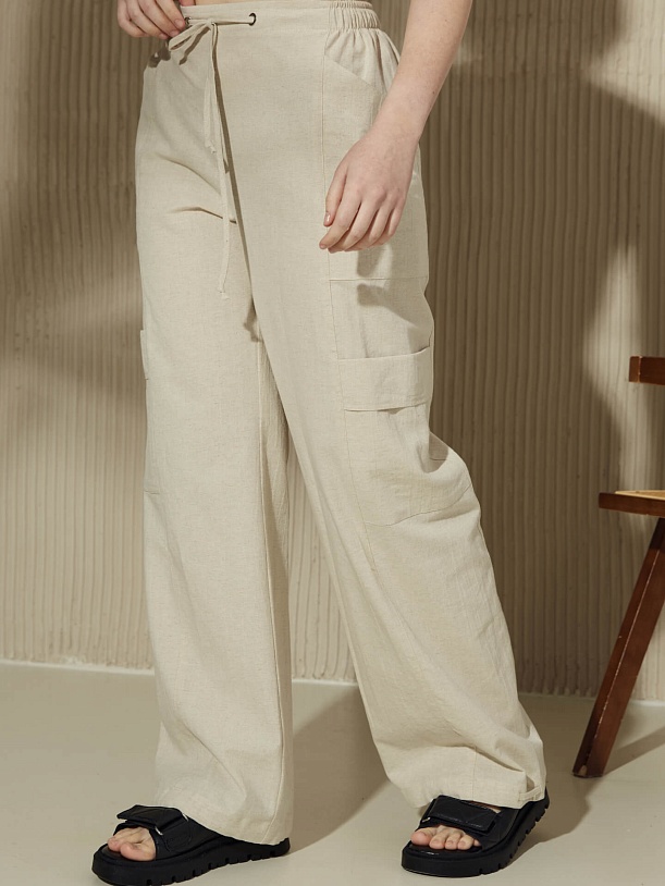 Карго выполнены из легкой ткани с содержанием 70% льна и 30% хлопка, что несомненно обрадует ценителей натуральности и экологичности материалов.