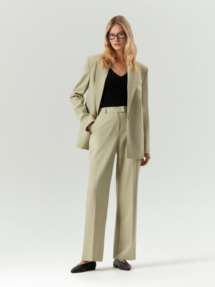 Лаконичные брюки полной длины, высокой посадки и с легким расклешением смотрятся очень стильно. Они отлично завершат деловой или выходной образ. Красивый оттенок между хаки и фисташковым сделает нежнее любые образы и впишется в офисный дресс-код. Дополнить образ с брюками можно жакетом из комплекта