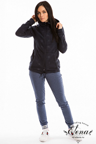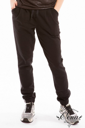 Спортивные брюки из футер петли с лайкрой. Зауженный покрой к низу, пояс на резинке, по бокам расположены карманы. Через петли в поясе продернут шнур. На передних частях манжет расположены нашивки.