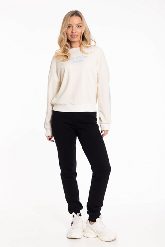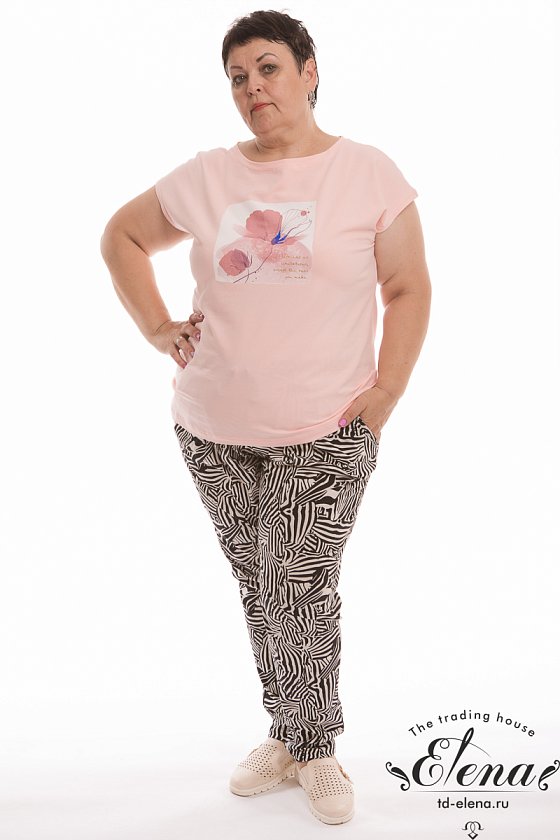 Брюки выполнены из кулирки с набивным рисунком. По бокам размещены карманы. Брюки зауженные к низу, спереди от пояса заложены складки. Пояс притачной, на резине и шнуре.