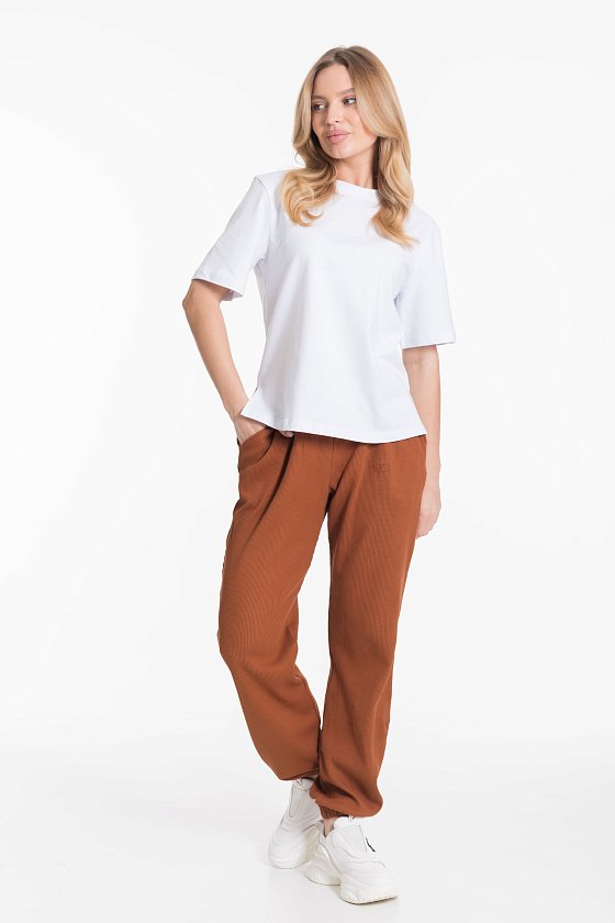 100% хлопок обеспечивает воздухопроницаемость и мягкость материала, что делает такие брюки отличным выбором для повседневного использования. Вафельная текстура материала придает изделию интересный и стильный вид.