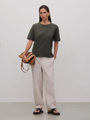 Бежевые брюки на каждый день. Выполнены из хлопка с небольшим добавлением эластана для большего комфорта. В нижней части брючин имеются кулиски с завязками, которые позволяют регулировать фасон, стилизуя брюки под настроение. Модель имеет резинку сзади для более комфортной посадки. Дополнена двумя фальш-карманами. Брюки изготовлены без подкладки