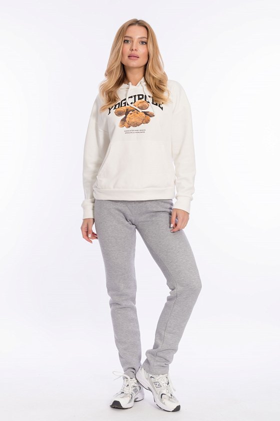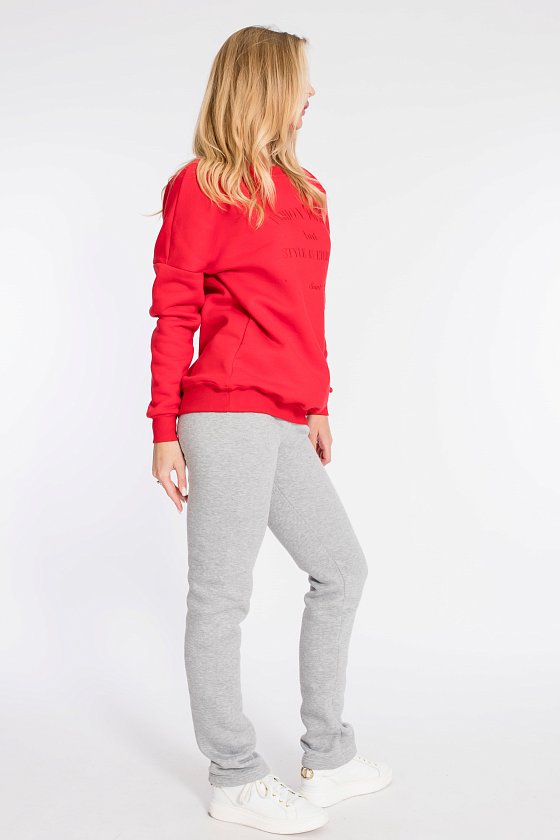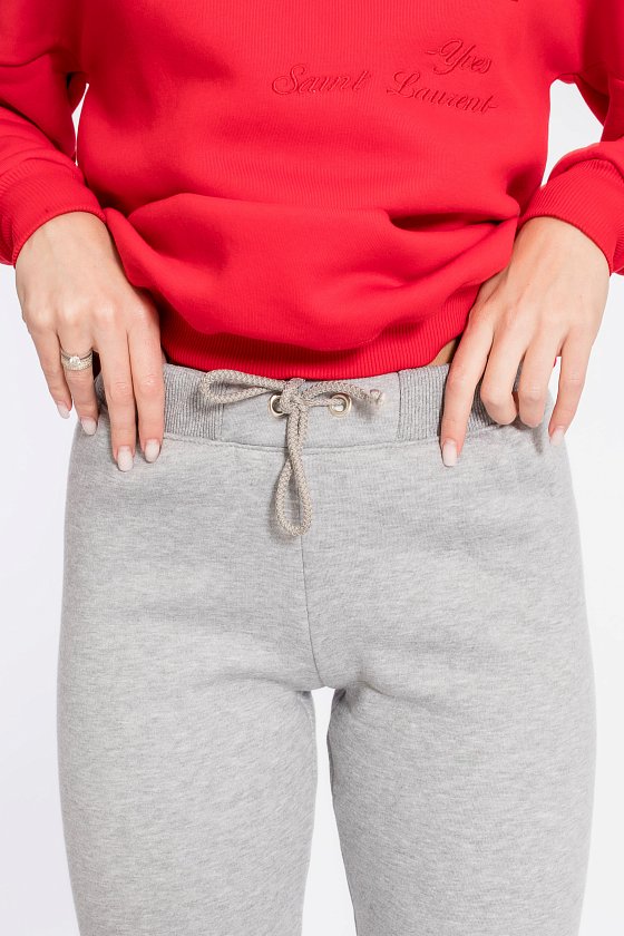 Тёплые спортивные брюки пригодятся для прогулок в холодное время года. Брюки выполнены из полотна с начёсом. Посадка стандартная, на талии, в пояс вставлена резина. Спереди пояс с люверсами, через которые проложен шнур.