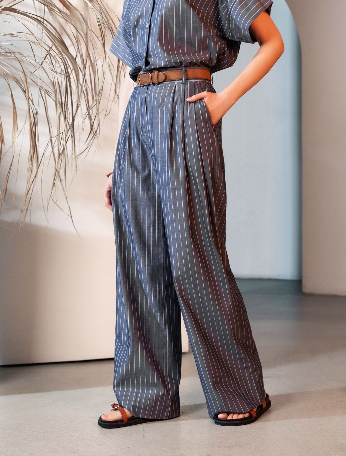 Свободные брюки палаццо серо-синего цвета в полоску из легкого хлопкового поплина плотностью 106 Г/м2— выбор, который легко выделит в любой обстановке. Классические брюки в тонкую полоску создают идеальный силуэт, визуально вытягивают и стройнят фигуру. Принт добавляет динамики и оригинальности даже самым лаконичным комплектам, делая этот предмет гардероба настоящим хитом сезона. Натуральный состав ткани обладает высокой воздухопроницаемостью, а также способностью поглощать и отдавать влагу. В повседневных брюках будет очень комфортно, благодаря правильной регуляции температуры тела. Брюки подходят на маленький и высокий рост, а так же на любую фигуру, позволяя подчеркнуть достоинства и скрыть возможные недостатки. С палаццо на высокой посадке вы можете создать различные образы, от делового шика до повседневного кэжуал, главное правило — баланс объемов , т.е. менее свободный верх к широкому низу, заправлять верх или выбирать укороченные модели. Полоска добавляет графичности, поэтому отлично сочетается с монохромным верхом для вытягивания силуэта или контрастными цветами. С этими стильными брюками можно создавать эффектные наряды как на выход, так и для ежедневных рабочих дел или простых прогулок.