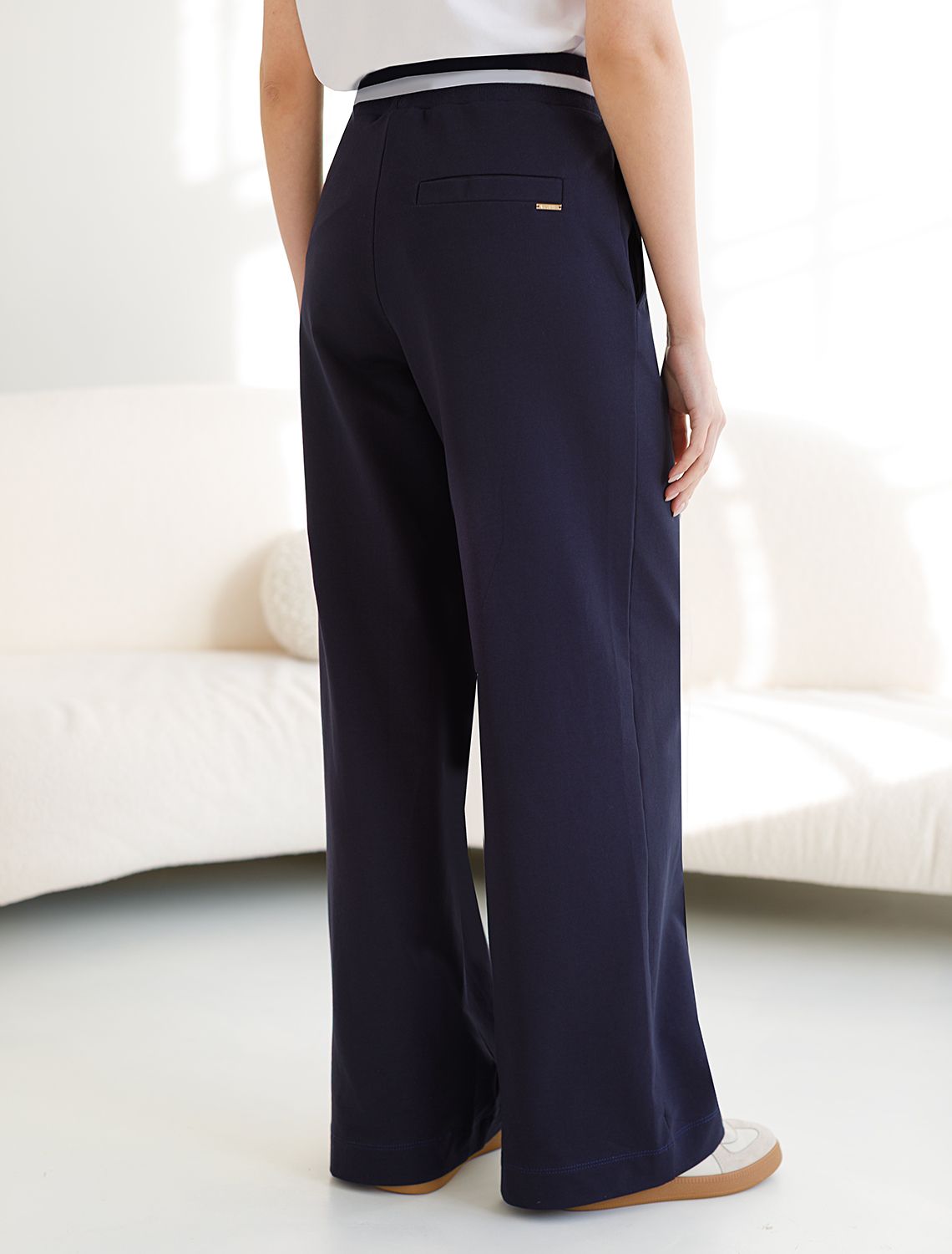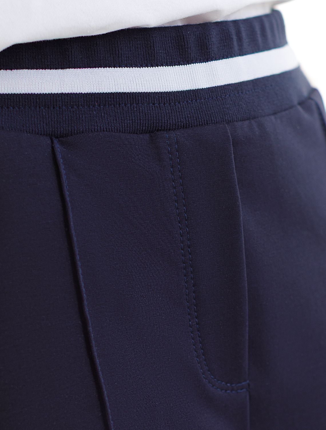 Брюки темно-синего цвета с удобным эластичным поясом на резинке и карманами по бокам выполнены из премиального футера-двухнитки плотностью 240 Г/м2. Наличие эластана в составе гарантирует комфорт и долговечность изделия, материал хорошо пропускает воздух, позволяя телу дышать. Свободный прямой крой обеспечивает свободу движений и максимальное удобство в любых ситуациях, поэтому они подойдут и на большие размеры, а так же на высокий или низкий рост. Фигура подчеркивается, а силуэт визуально вытягивается за счет кроя палаццо и застроченных декоративных стрелок. В повседневных трикотажных брюках вы будете чувствовать себя комфортно и уверенно, наслаждаясь каждым моментом дня. Спортивные брюки подходят для демисезонного использования, в летний период, для занятий спортом в помещении и на улице, а также как часть стиля casual.
