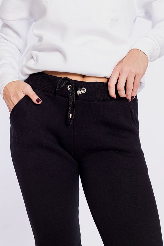 Брюки женские из полотна с начёсом. Низ брюк на манжетах, пояс на резине со шнуром, по бокам расположены карманы.