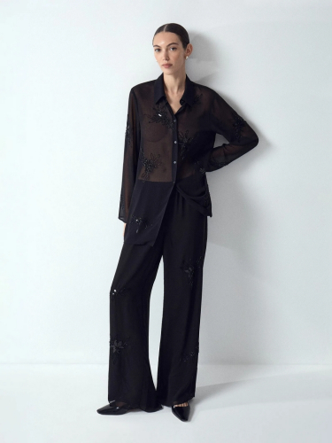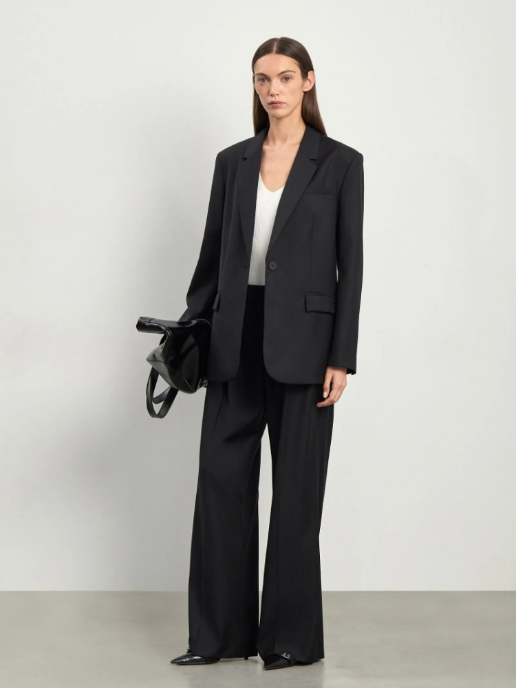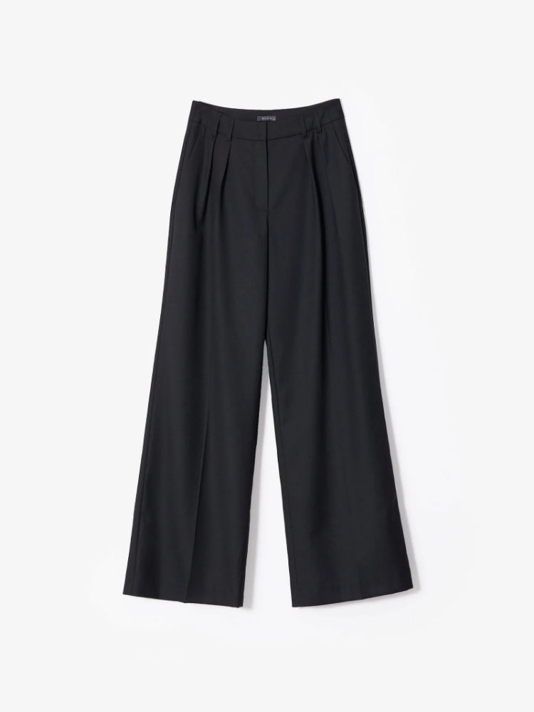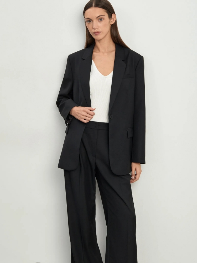 Актуальные брюки в чёрном цвете для повседневных и деловых образов. Материал почти наполовину состоит из шерсти. Элегантная модель с защипами имеет высокую посадку и широкий крой. Застёгивается на молнию и потайную застёжку под планкой. Сзади располагаются декоративные узкие карманы с листочкой и шлёвки для ремня. Завершить образ можно жакетом из комплекта