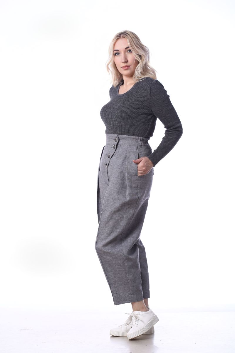 Описание: Брюки с застежкой на пуговицы, пояс на резинке, карманы, складки