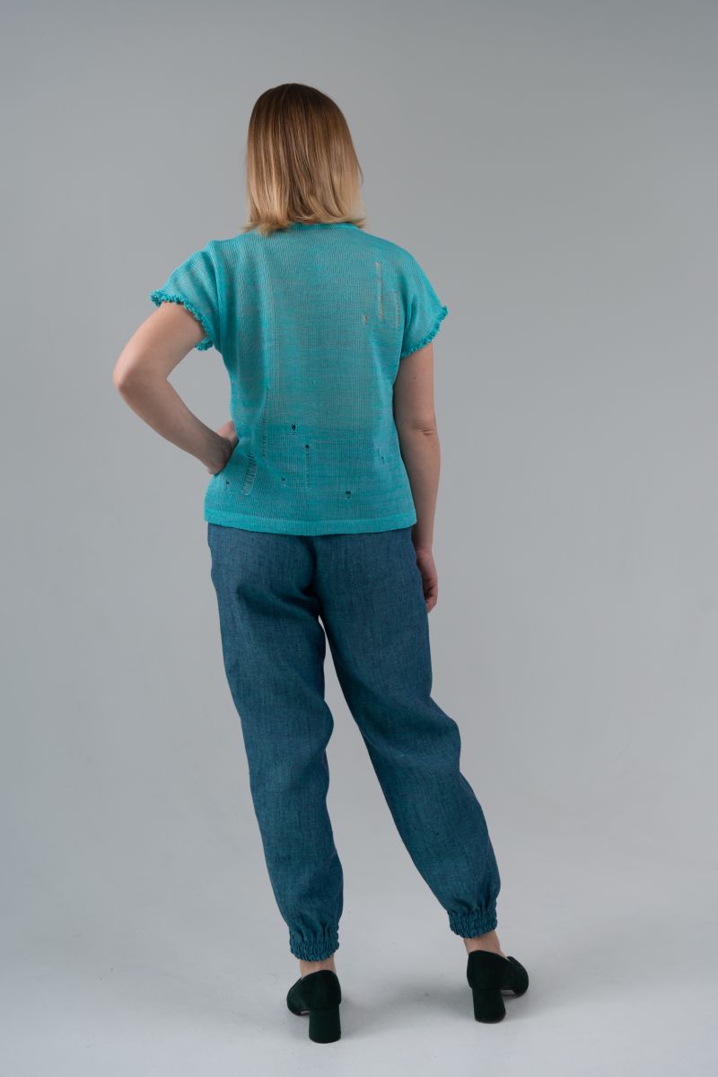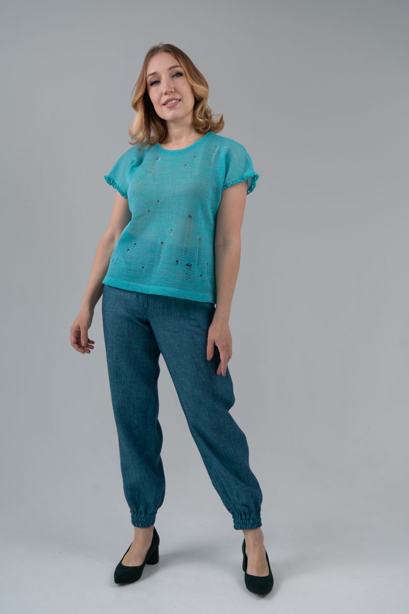 Описание: Брюки с карманами, пояс на резинке, молния, пуговица, внизу сборка на резинке.