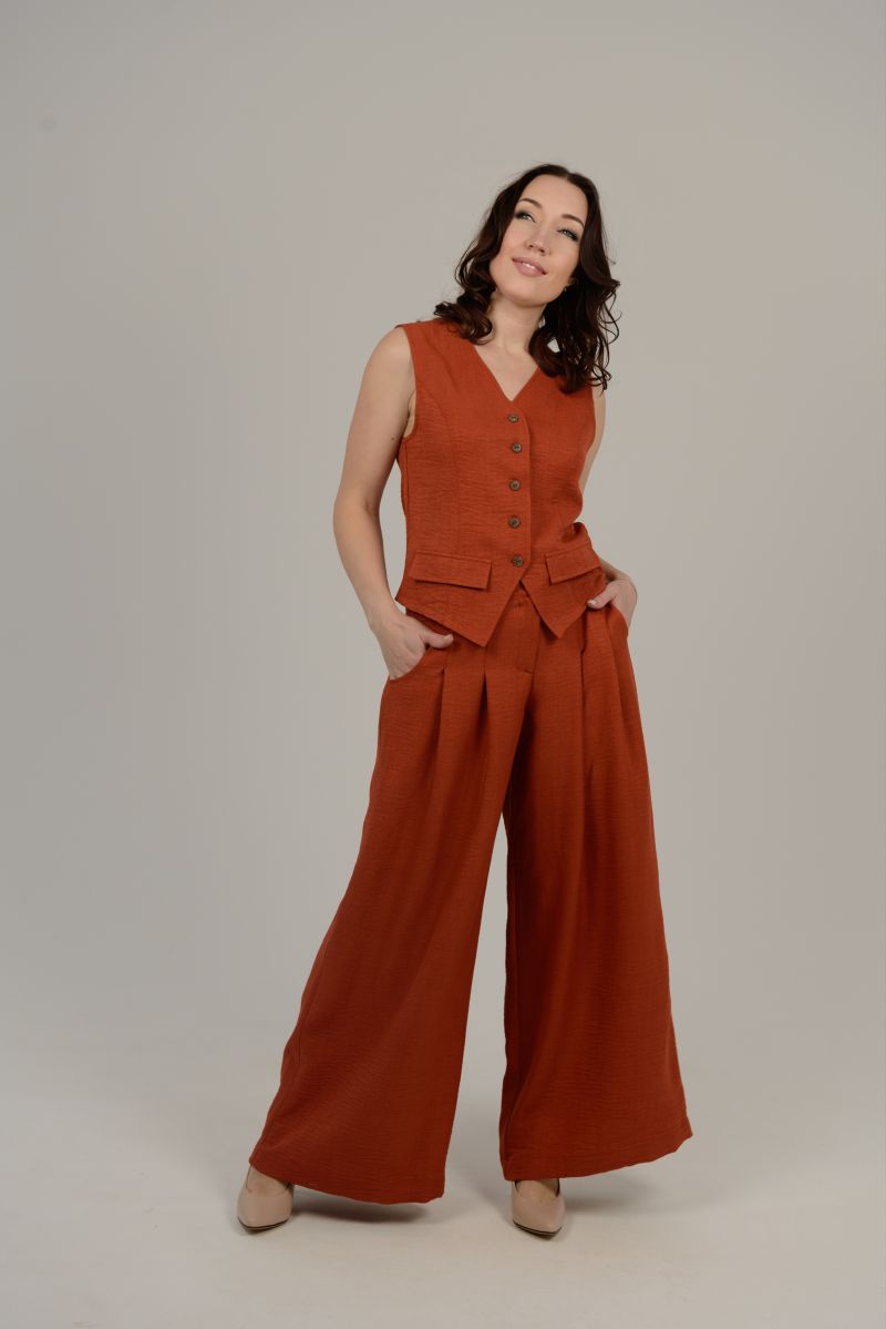 Описание: Брюки на поясе, молния, карманы, складки.