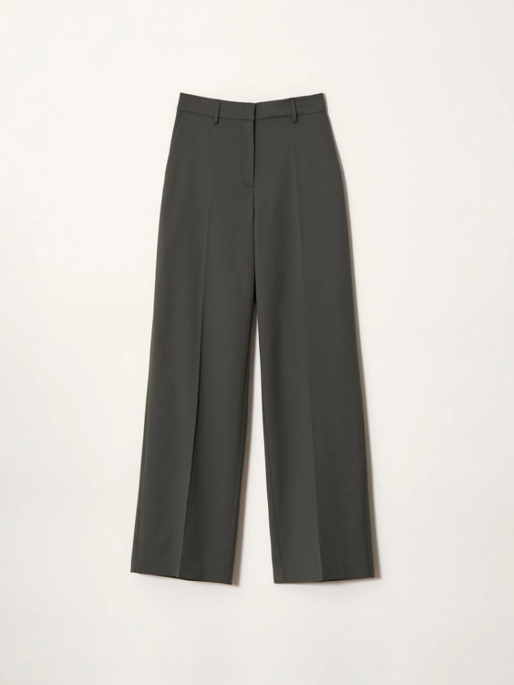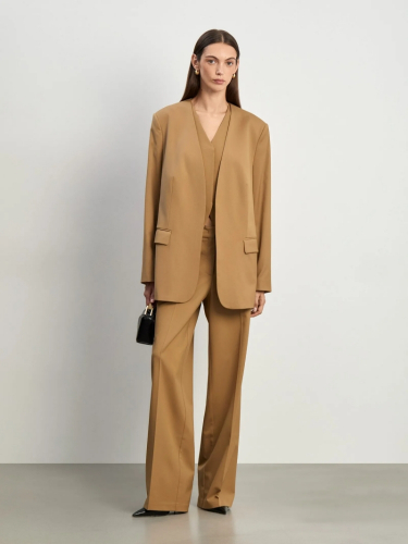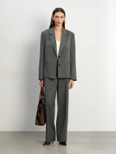 Брюки цвета хаки для модных повседневных образов. Выполнены из материала с содержанием шерсти: её чуть меньше половины. Свободная модель прямого кроя имеет высокую посадку. Дополнена широкими шлёвками для ремня. Сзади располагается один декоративный узкий карман с листочкой. Завершить образ с брюками можно жакетом из комплекта и базовой водолазкой