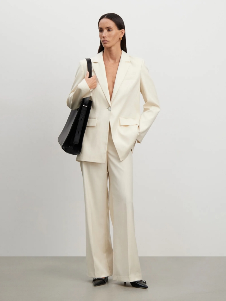 Лаконичные брюки в молочном цвете отлично подойдут для деловых образов. Модель широкого кроя полной длины имеет высокую посадку. По бокам расположены функциональные карманы. Брюки без пуговицы застёгиваются на молнию, скрытую планкой. Изделие выполнено из материала с высоким содержанием вискозы, без подкладки. Образ с брюками можно дополнить жакетом из комплекта