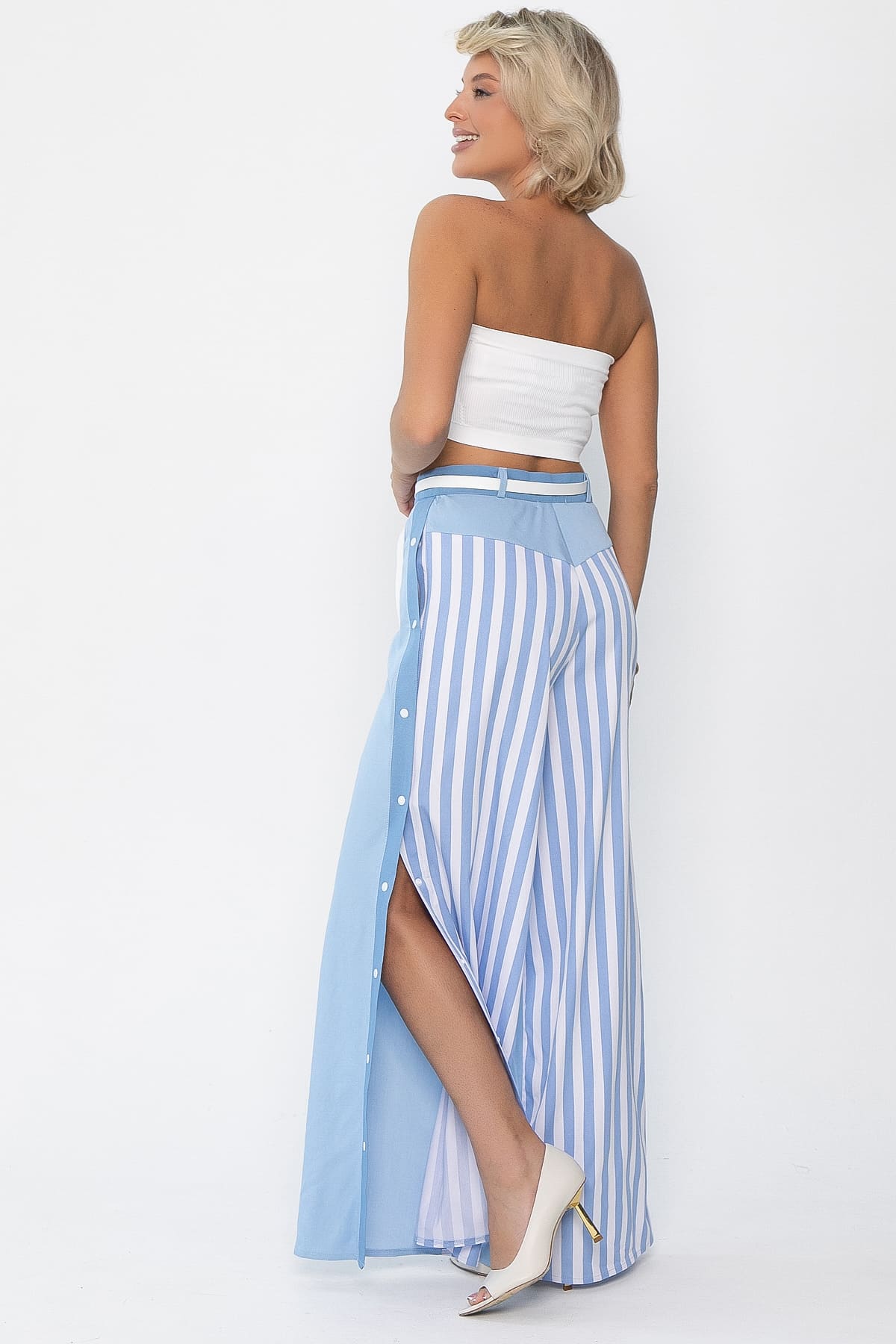 Стильные женские брюки полуприлегающего силуэта обеспечат комфорт в повседневной жизни. Модель с притачным поясом на застёжке-гульфике. Длина — до щиколотки, пояс на естественной линии талии. Передняя часть с карманами по бокам и маленьким накладным кармашком. По бокам застёжки на кнопках. Задняя часть джинсов украшена принтом в полоску.