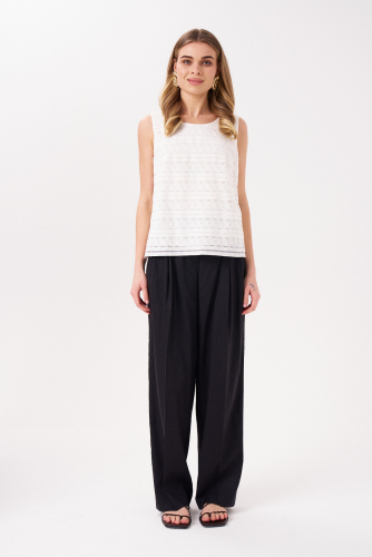 Брюки женские из поливискозной ткани с содержанием льна для повседневной носки и особых случаев. Брюки прямые. Верхний срез брюк обработан притачным поясом со вставкой на резинке, за счет чего брюки будут отлично облегать по вашей фигуре. В области боковых швов располагаются прорезные карманы. Отлично сочетается с блузками, футболками, топами, майками, жакетами. Данные брюки в черном оттенке отлично будут смотреться на вас и радовать на протяжении целого дня. Данные брюки отлично будут подходит для жарких дней. Заказывайте летние брюки больших размеров, чтобы пополнить свой сезонный гардероб практичной вещью.