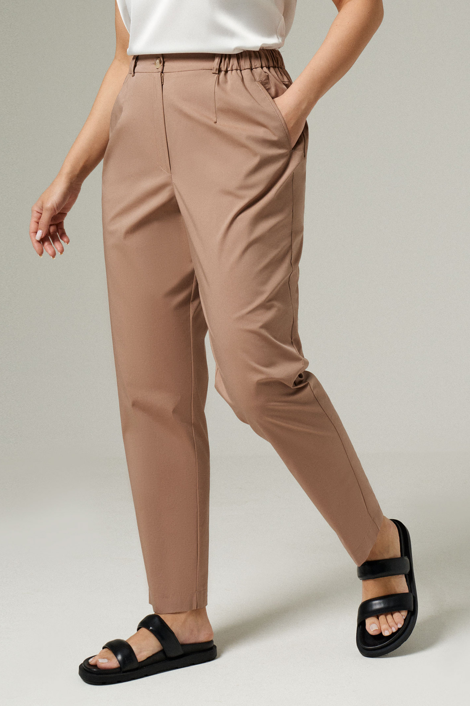 Брюки с высокой талией хорошо садятся по вашей фигуре и подчеркнет женственные формы. Данная модель слегка заужена к низу, поэтому отвлекает внимание от лишних сантиметров живота и бедер. Для комфортной носки пояс изделия дополнен встроченной резинкой и шлевками под ремень. Застежки – пуговица-петля и змейка в гульфике. Карманы прорезные. Хлопковые брюки из мягкой ткани отлично сочетаются с футболками, топами, блузками, жакетами. Их уместно носить на работу, деловые и дружеские встречи. Обувь можно выбрать на каблуке или спортивного вида, в зависимости от создаваемого образа. Предлагаем вам купить летние легкие брюки в размерах 50-58