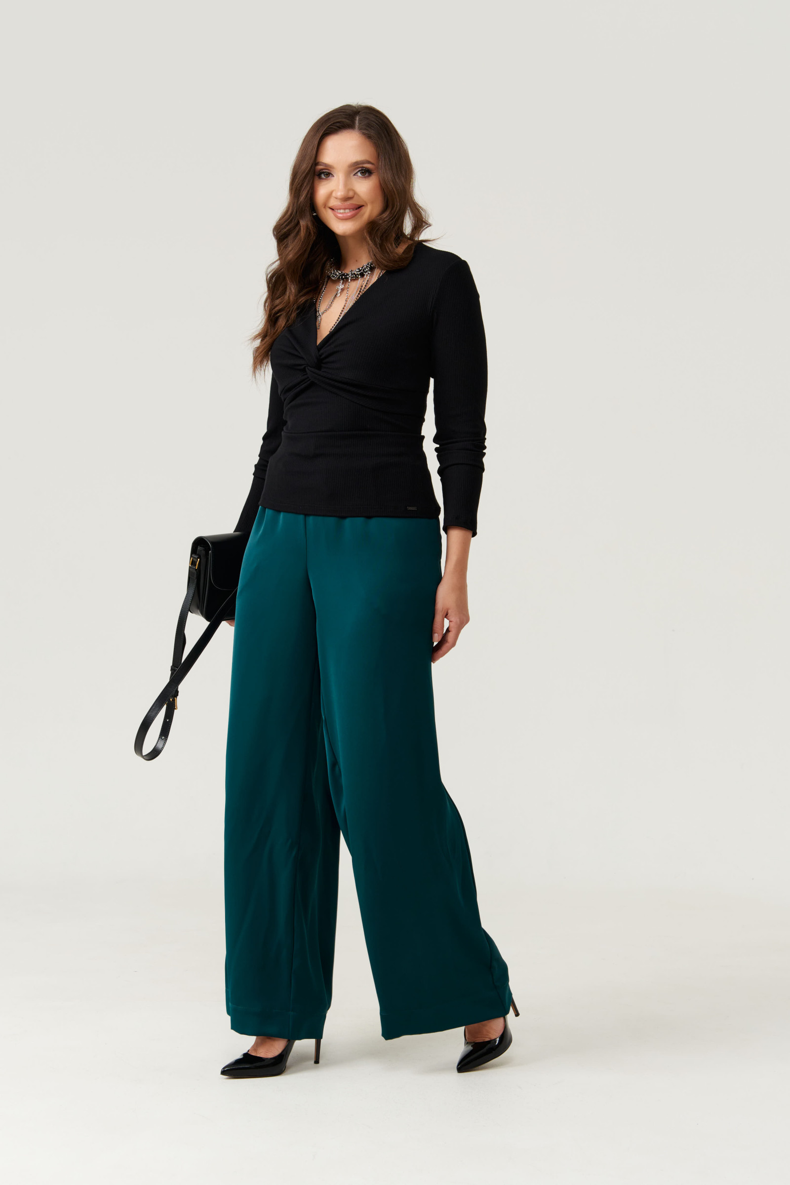 Брюки женские прямые из струящейся атласной ткани. Верхний срез брюк обработан притачным поясом, Пояс на резинке, по переду имеется отрезная прямая часть. В пояс вставлены завязки, за счет чего вы сможете регулировать облегание в области талии. На концах шнурков металлические наконечники. В брюках в боковом шве имеются потайные боковые карманы, что очень удобно. Брюки для повседневной носки либо для торжественных случаев. Модные и очень практичные брюки в изумрудном цвете станут базовой вещью в вашем гардеробе.