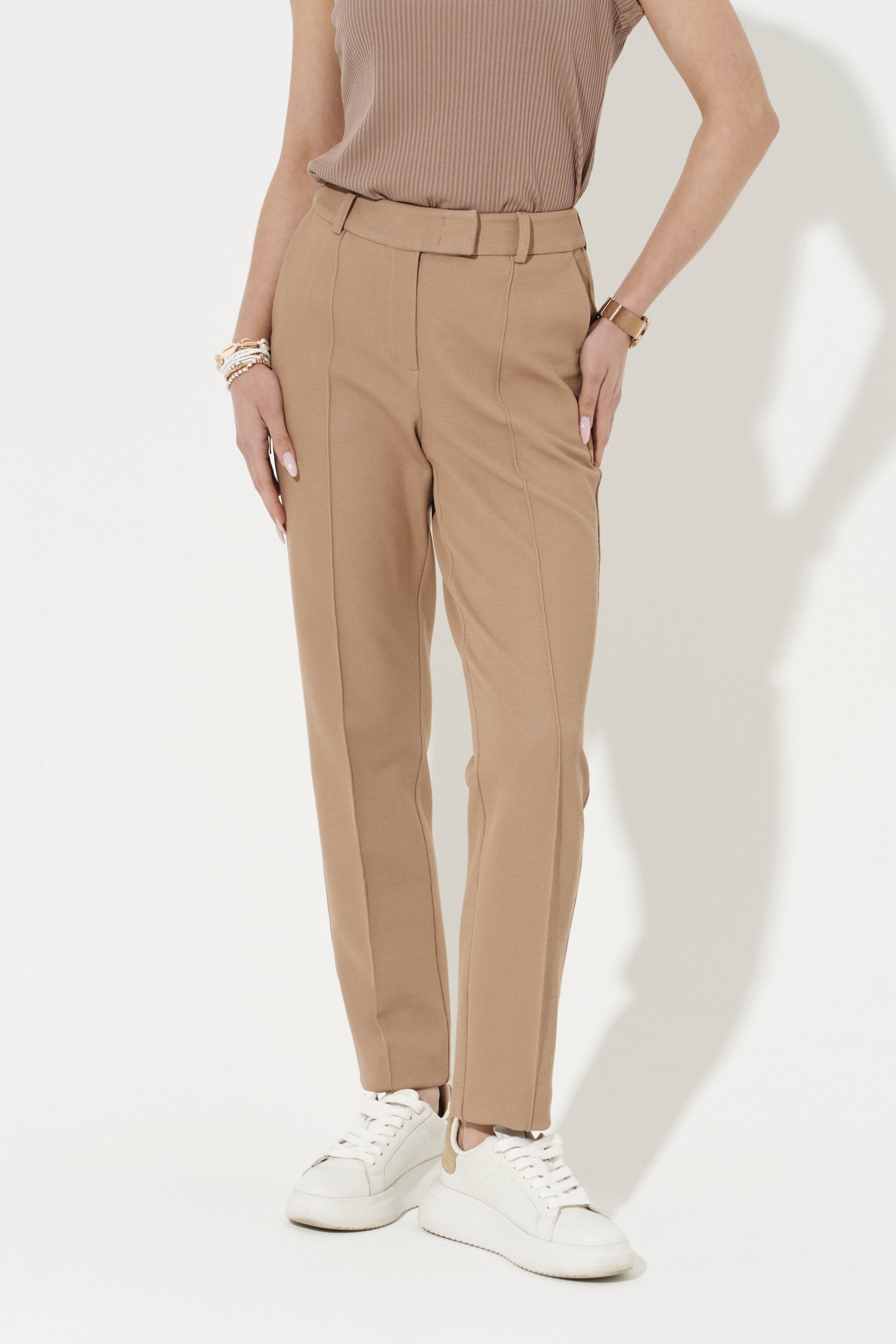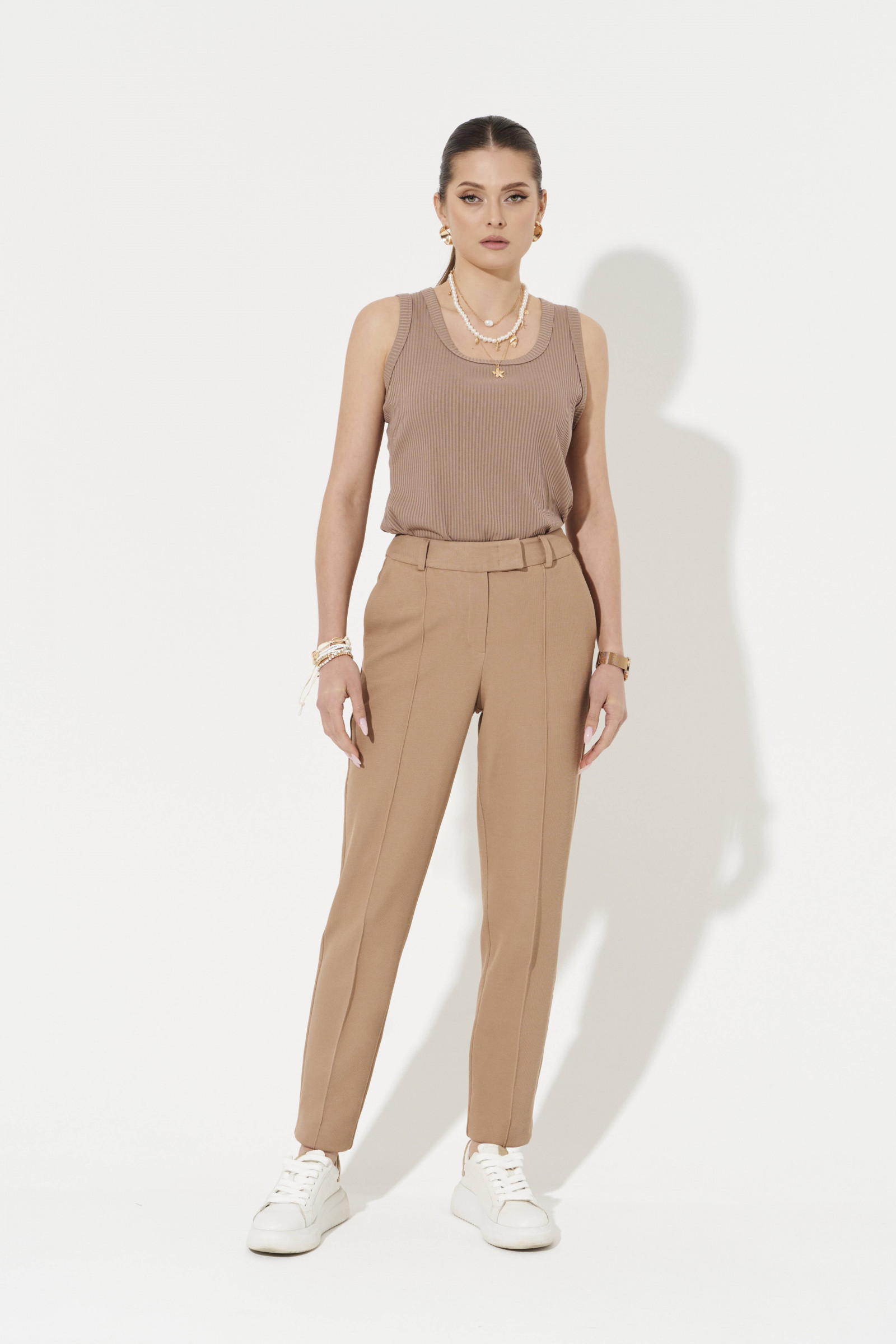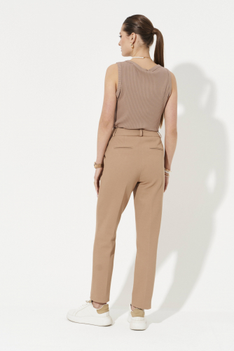 Брюки женские прямые из мягкого трикотажа для повседневной носки. Верхний срез брюк обработан притачным поясом, застежка на два крючка, а также имеется застежка на тесьму-молнию в среднем шве брюк. В брюках расположен в боковом шве карман с подкройным бочком. Задняя часть брюк и имеет две талиевые вытачки и два прорезных кармана в рамку с двумя обтачками. Брюки классические, но за счёт трикотажа очень удобные. Отличный классический вариант брюк, которые будут гармонично смотреться под любые изделия.
