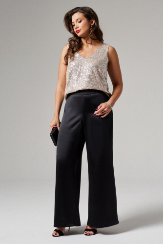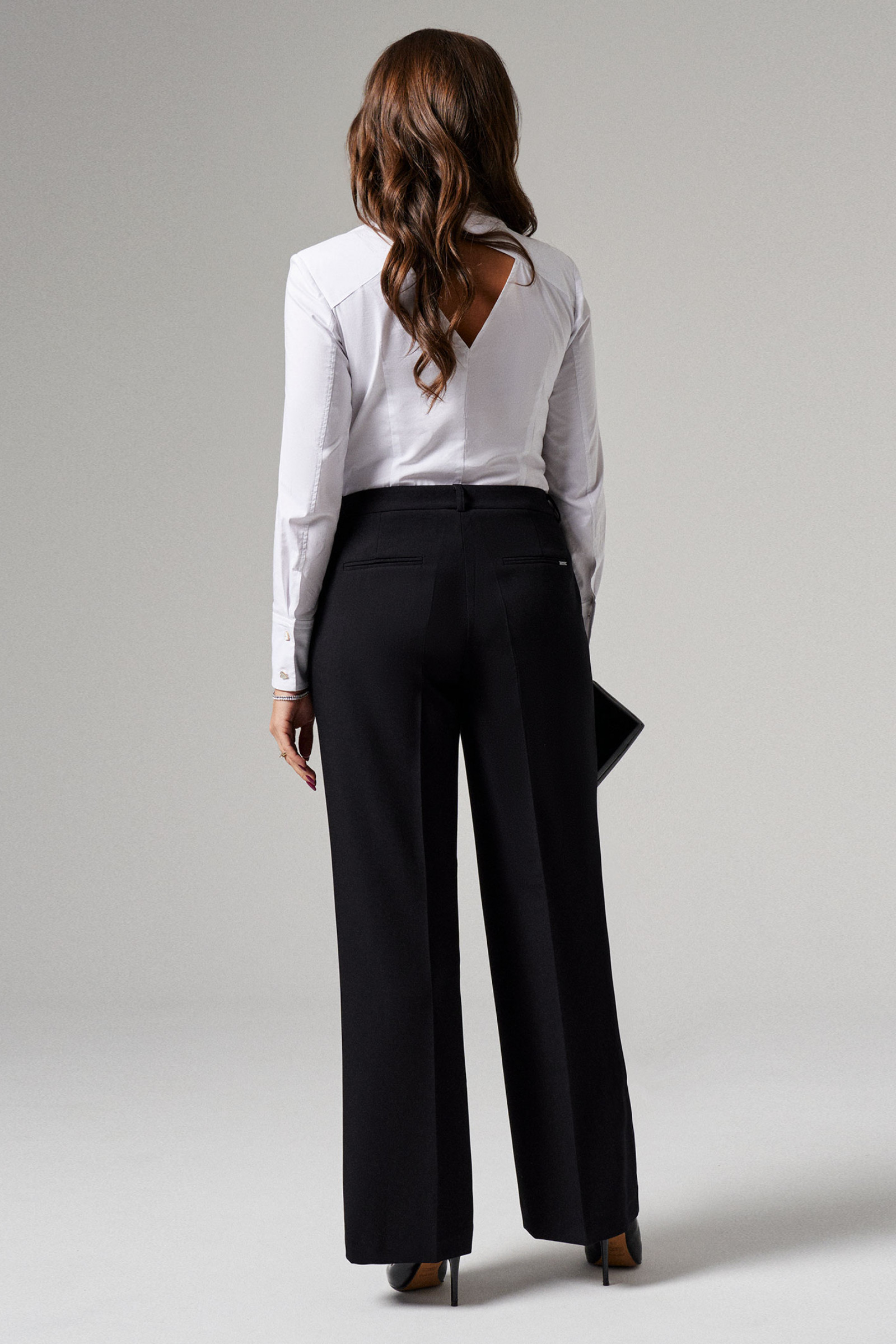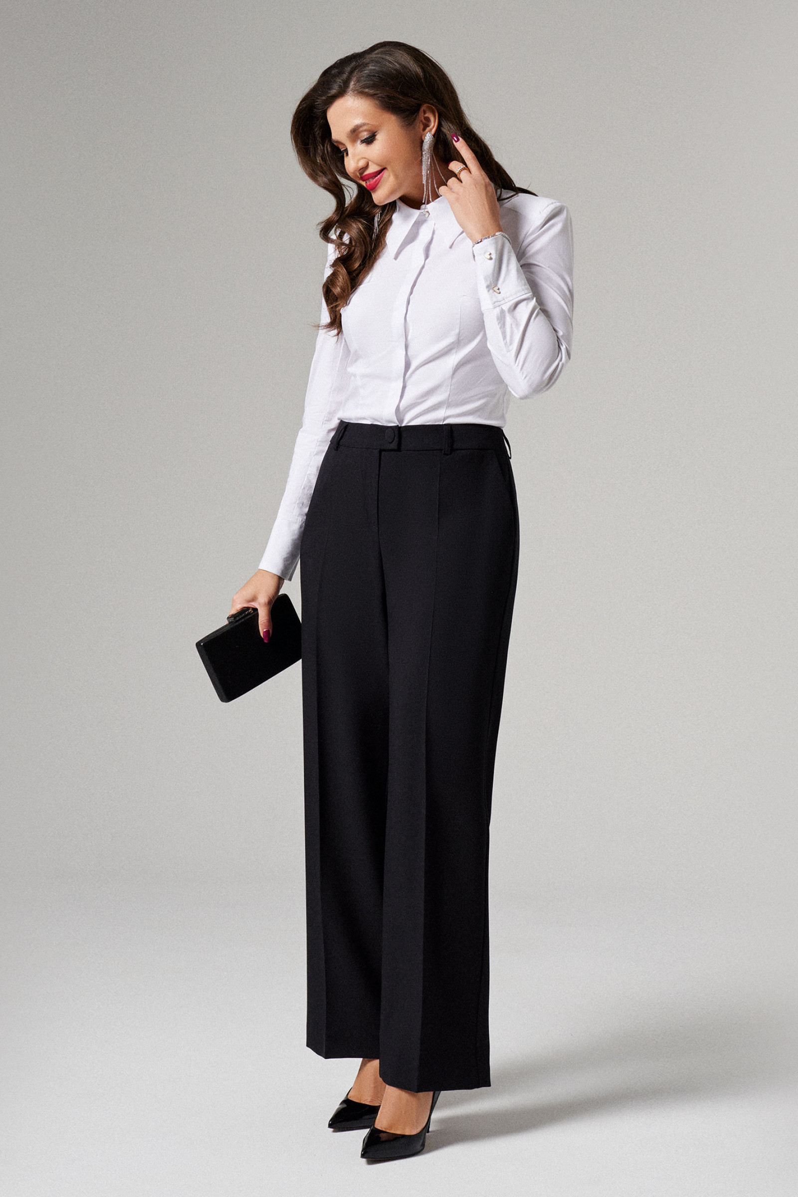Классические женские брюки клеш станут находкой для делового и повседневного гардероба. Широкие брюки со стрелками будут уместны и на городской прогулке, и на официальной встрече в офисе. Благодаря универсальному дизайну и клешу от бедра, женские брюки больших размеров визуально вскрывают лишние сантименты и делают силуэт стройнее. Застежка-молния гармонично дополнена шлевками для дополнения модели кожаным или текстильным ремнем. Брюки черные прекрасно будут сочетаться с блузами, рубашками, джемперами. Вы можете заказать широкие штаны женские из качественного материала по выгодной цене.