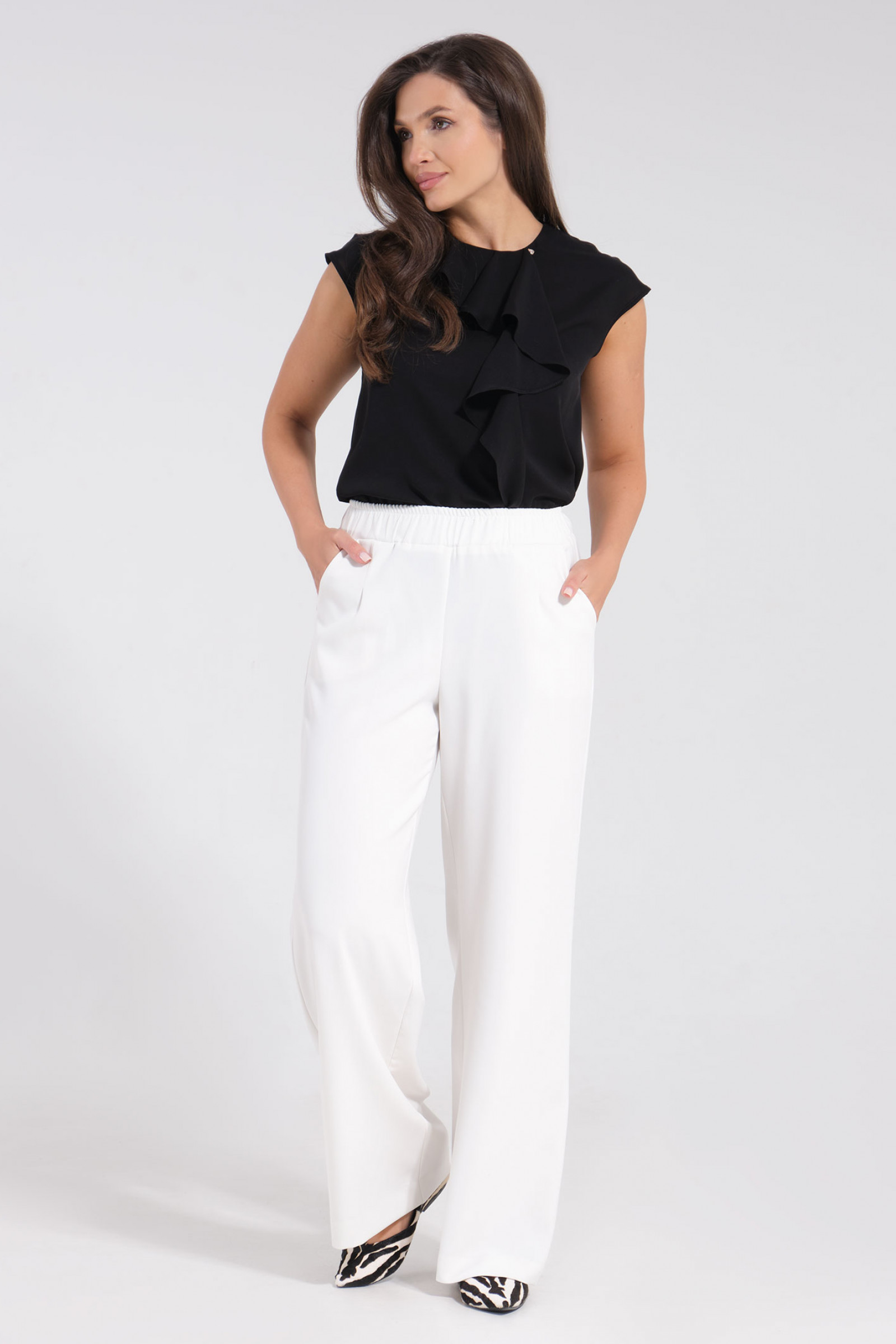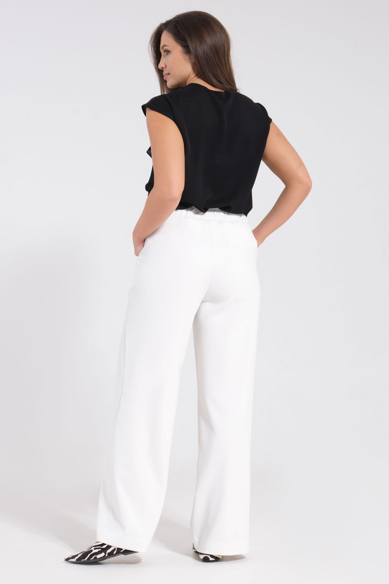 Женские брюки из поливискозной ткани идеально подходят для повседневной носки. Верхний срез обработан притачным поясом со вставкой на резинке, обеспечивающим комфортную посадку. Пояс дополнен шлевками, что позволяет носить их с ремнем для дополнительной регулировки. Передняя часть украшена двумя талиевыми вытачками, создающими аккуратный силуэт. Задняя часть также оснащена двумя талиевыми вытачками, а также имеется карман с листочкой и лейблом с логотипом бренда. Эти брюки белого оттенка сочетают стиль и практичность, делая их универсальным элементом гардероба.