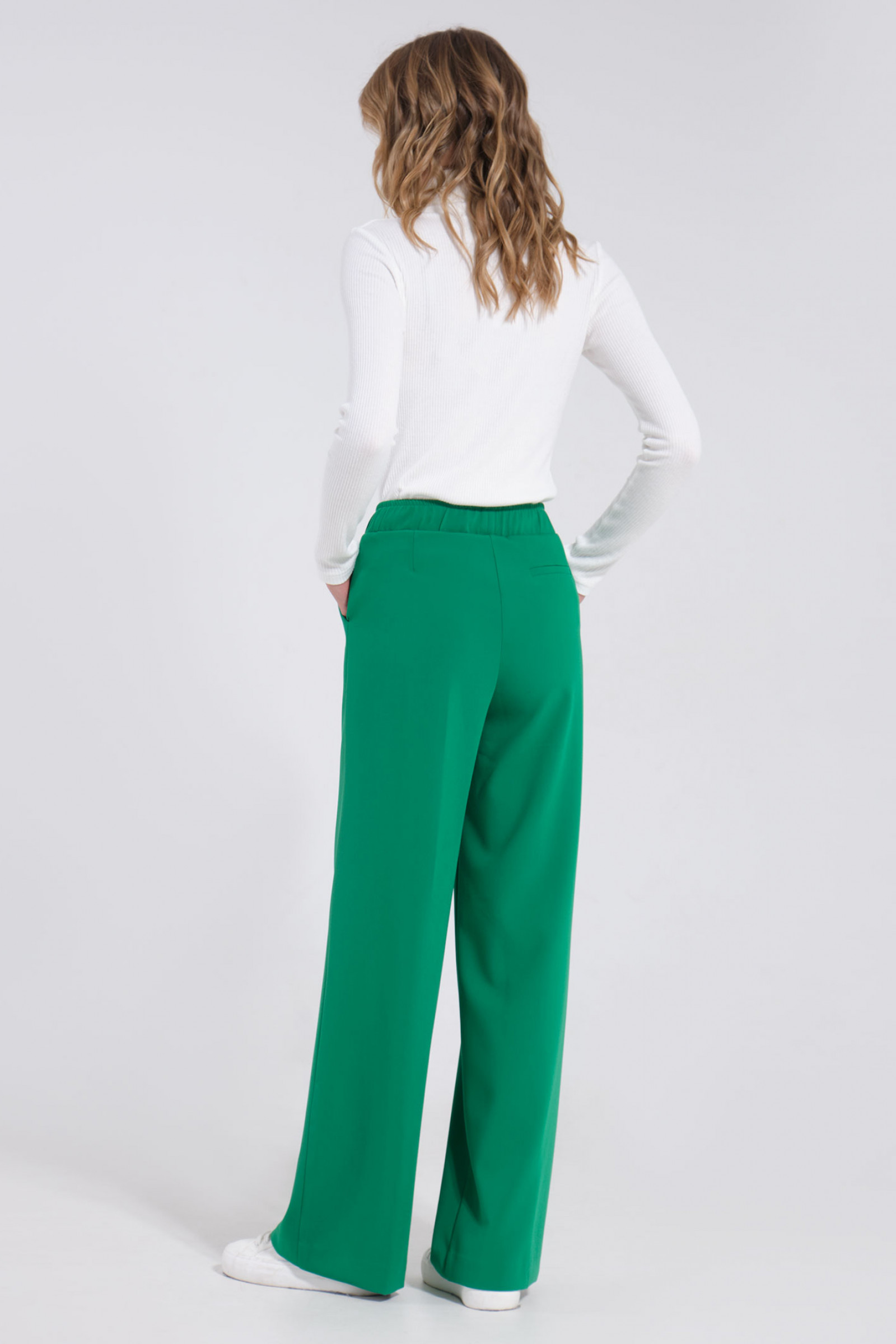 Женские брюки из поливискозной ткани идеально подходят для повседневной носки. Верхний срез обработан притачным поясом со вставкой на резинке, обеспечивающим комфортную посадку. Пояс дополнен шлевками, что позволяет носить их с ремнем для дополнительной регулировки. Передняя часть украшена двумя талиевыми вытачками, создающими аккуратный силуэт. Задняя часть также оснащена двумя талиевыми вытачками, а также имеется карман с листочкой и лейблом с логотипом бренда. Эти брюки белого оттенка сочетают стиль и практичность, делая их универсальным элементом гардероба.