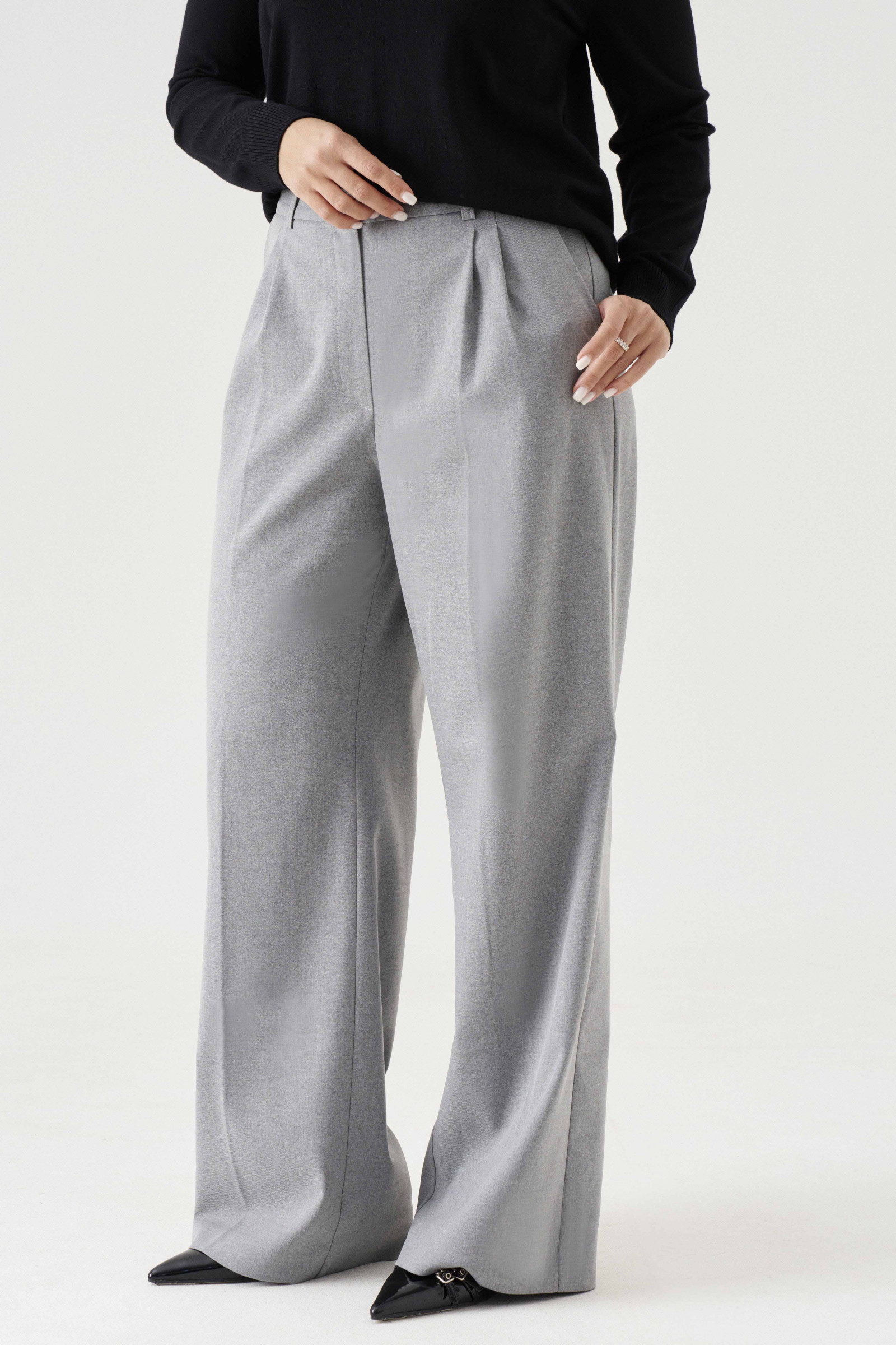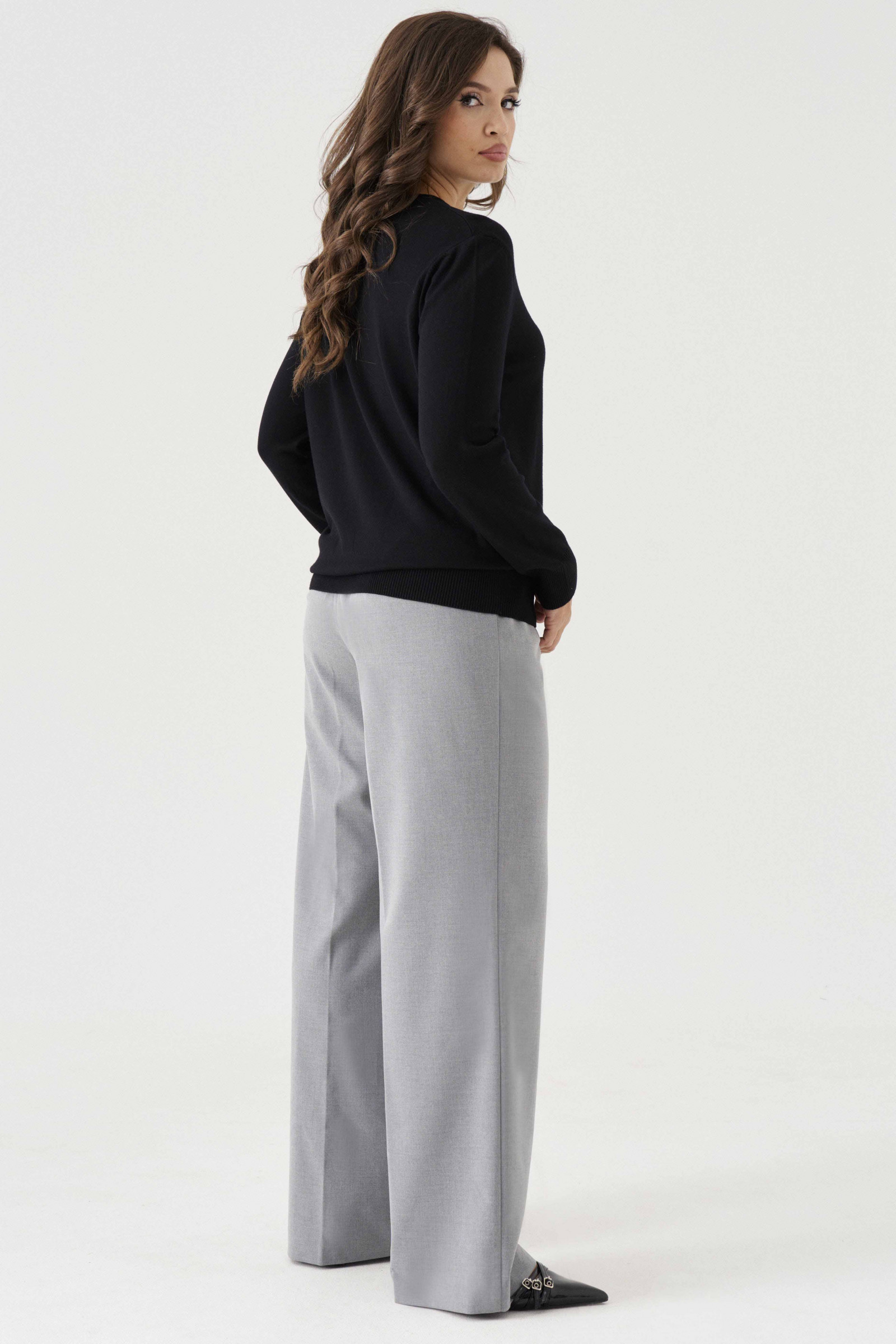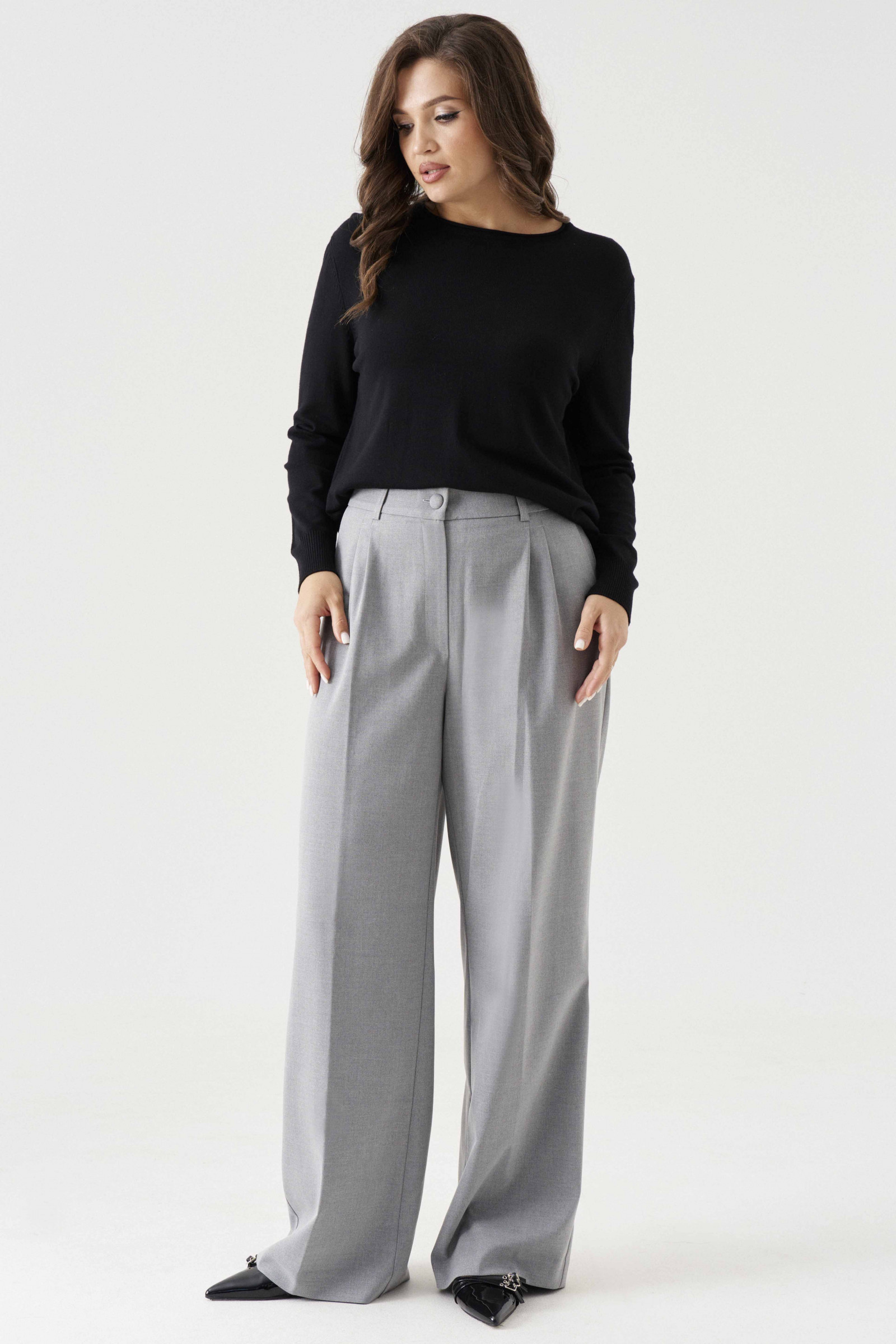 Однотонные брюки женские классические клеш пошиты из приятной на ощупь, плотной поливискозной ткани. Особенности их кроя: высокая посадка, свободный фасон, прорезные карманы в боковых швах, складки и стрелки от пояса, шлевки для ремня, застежка-молния и пуговица.