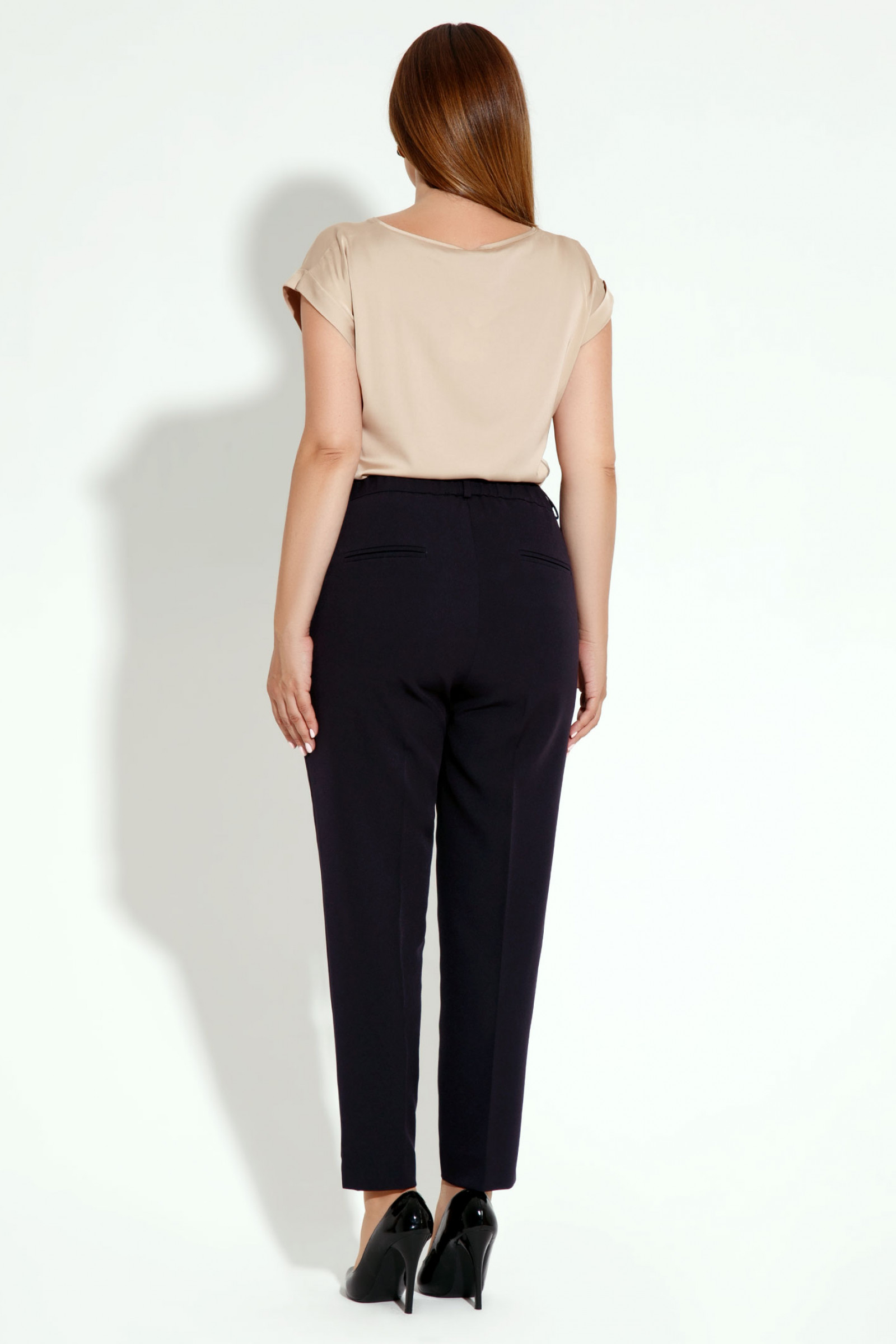 Лаконичные женские брюки большого размера изготовлены из легкой, приятной на ощупь эластичной ткани. Они хорошо тянутся, делая ноги более стройными и длинными.