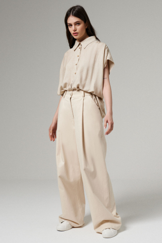 46 Брюки: Высота посадки - 30см, Длина брюк с поясом - 112см, Длина по внутреннему шву - 84см, Ширина брючин сверху - 70см, Обхват брюк по низу - 68см, Ширина по бедрам - 59см, Ширина по талии - 37см;