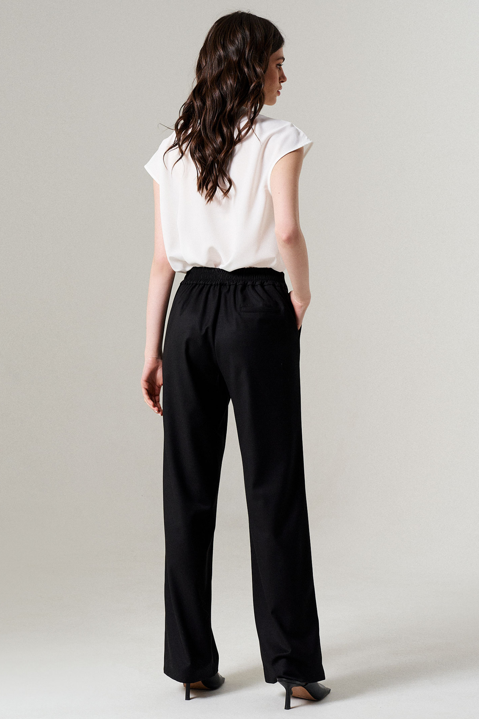 Брюки женские из поливискозной ткани для повседневной носки. Брюки прямые. Верхний срез брюк обработан притачным поясом со вставкой на резинке в задней части. Задняя часть брюк имеет карман с листочкой. В боковом шве располагаются потайные карманы. Стильные брюки, которые отлично будут смотреться на любой фигуре, а главное в них вы будете чувствовать себя комфортно.