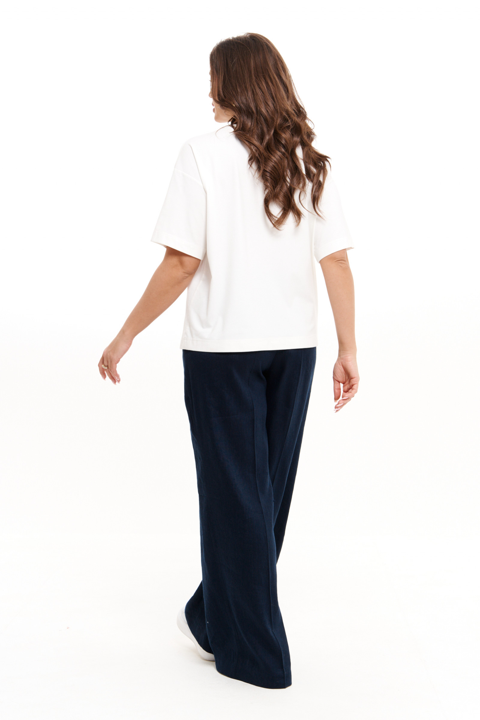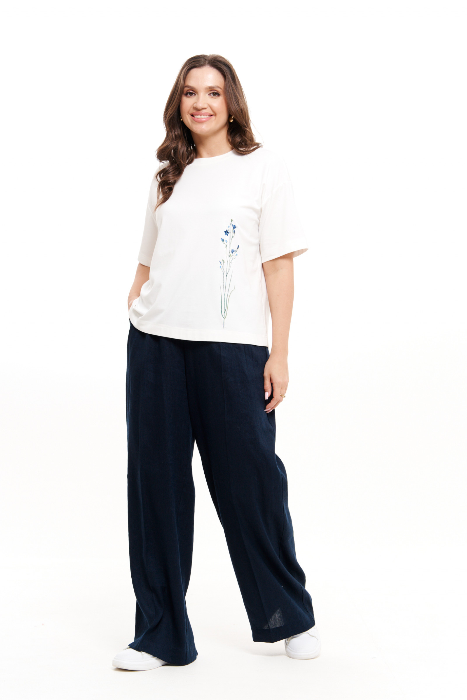 Женские летние брюки станут отличным выбором для тех, кто ценит комфорт и стиль в повседневной жизни. Модель выполнена из легкой льняной ткани с добавлением хлопка, что делает их идеальными для весеннего и летнего сезонов. Свободный крой и прямые линии подчеркивают классический и деловой стиль, позволяя легко сочетать брюки как с базовыми топами, так и с нарядными блузами. Благодаря притачному поясу со вставкой на резинке и регулирующим шнуркам, брюки отлично сидят на талии, обеспечивая комфорт на протяжении всего дня. Удобные боковые карманы добавляют функциональности, делая модель не только стильной, но и практичной. Синий цвет добавляет образу глубины и элегантности, подходящей как для офисного дресс-кода, так и для повседневного выхода. Эти женские брюки будут уместны на деловой встрече, прогулке в городе или в рамках повседневного гардероба. Классический крой и универсальный дизайн делают их базовым элементом любого гардероба, легко адаптируемым под различные стили. Независимо от того, ищете ли вы офисный образ или что-то легкое и летнее, эта модель идеально впишется в ваш гардероб, оставаясь актуальной в любое время года. Женственные и элегантные, они подчеркнут вашу индивидуальность и вкус.