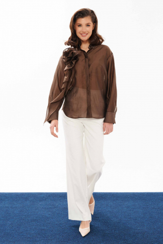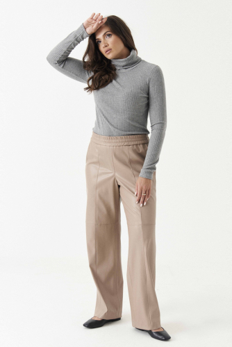 Брюки женские из поливискозной ткани для повседневной носки. Брюки прямые, слегка зауженные. На передней части брюк есть боковые карманы. Верх брюк обработан отрезным поясом, застёгивающийся на тесьму-молнию и потайной крючок. На задней части брюк есть талиевые вытачки и прорезные карманы. Ткань однотонная.