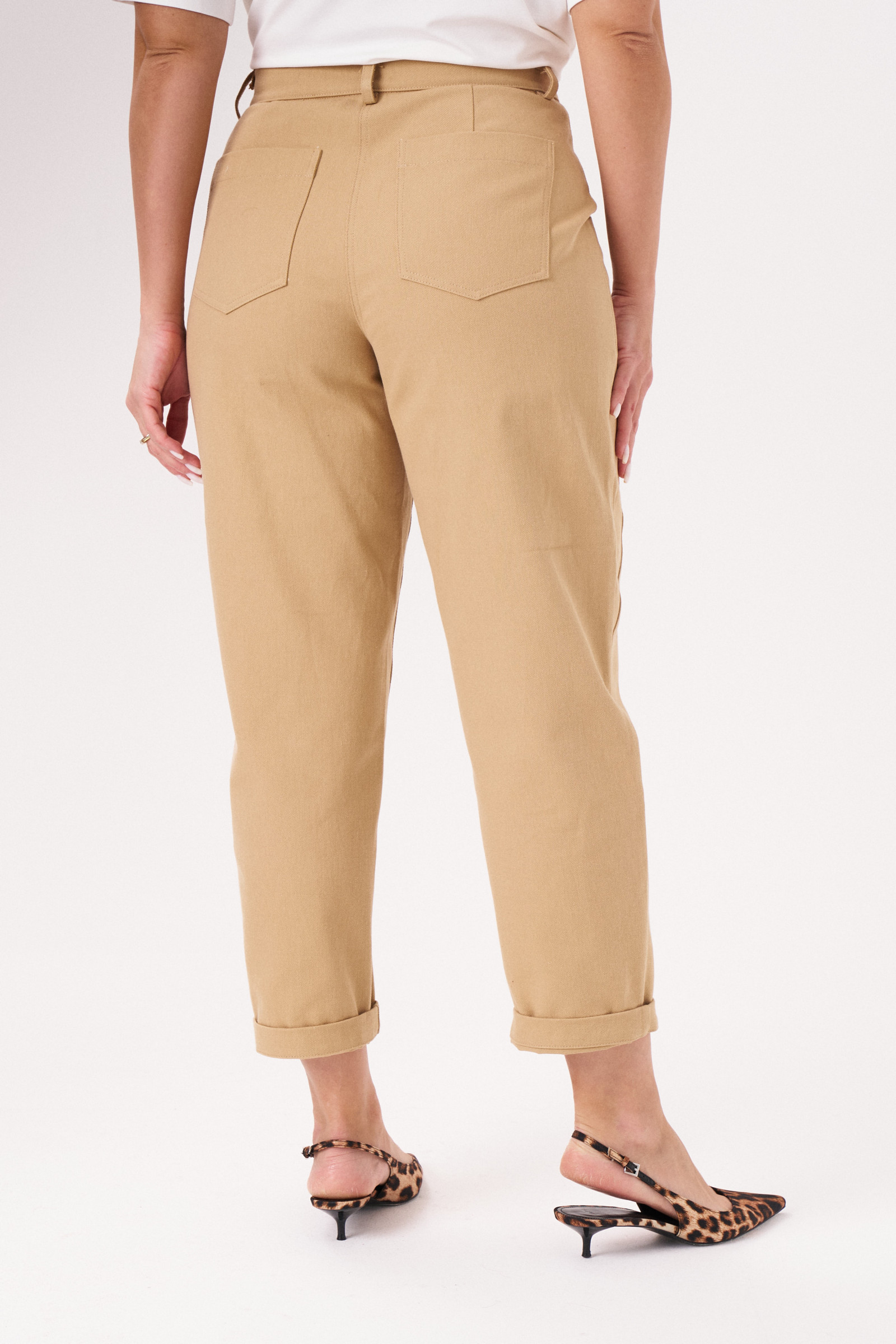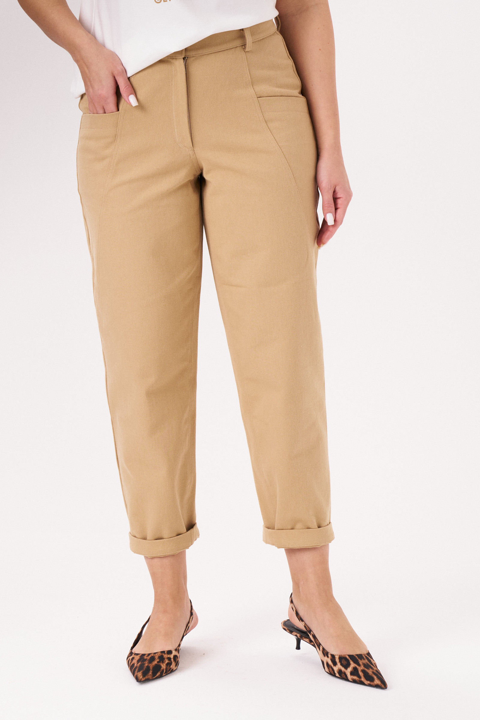 Брюки женские из джинсовой ткани с большим содержание хлопка для повседневной носки. Брюки свободные, чуть зауженные к низу. Верхний срез брюк обработан притачным поясом с застежкой на одну обметанную петлю и одну пуговицу, а также имеется застежка на тесьму-молнию в среднем шве брюк. Брюки со шлевками, что дает возможность носить их под пояс, тем самым вы сможете регулировать облегание в области талии. Передняя часть брюк имеет декоративный подрез с карманами. Задняя часть брюк имеет две талиевые вытачки и два накладных кармана. Очень стильные брюки в бежевом оттенке, которые безусловно будут радовать вас своим чудесным видом и прекрасной посадкой.