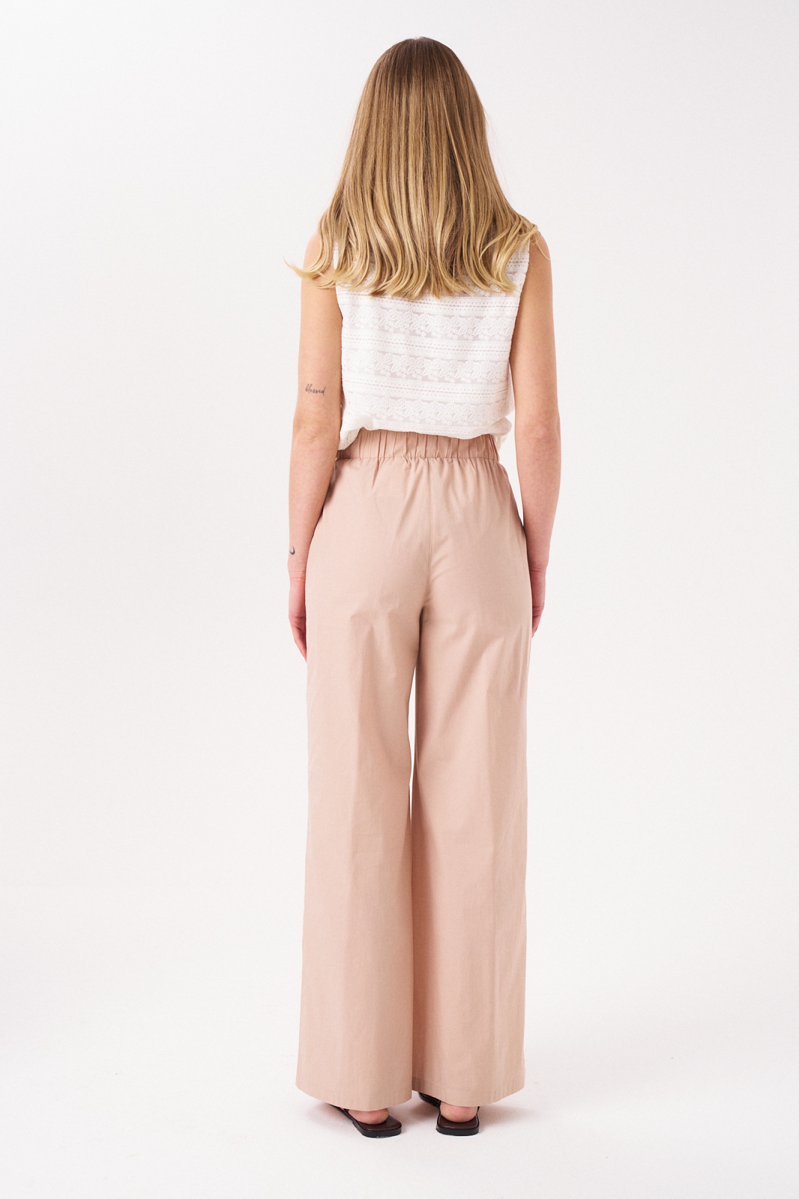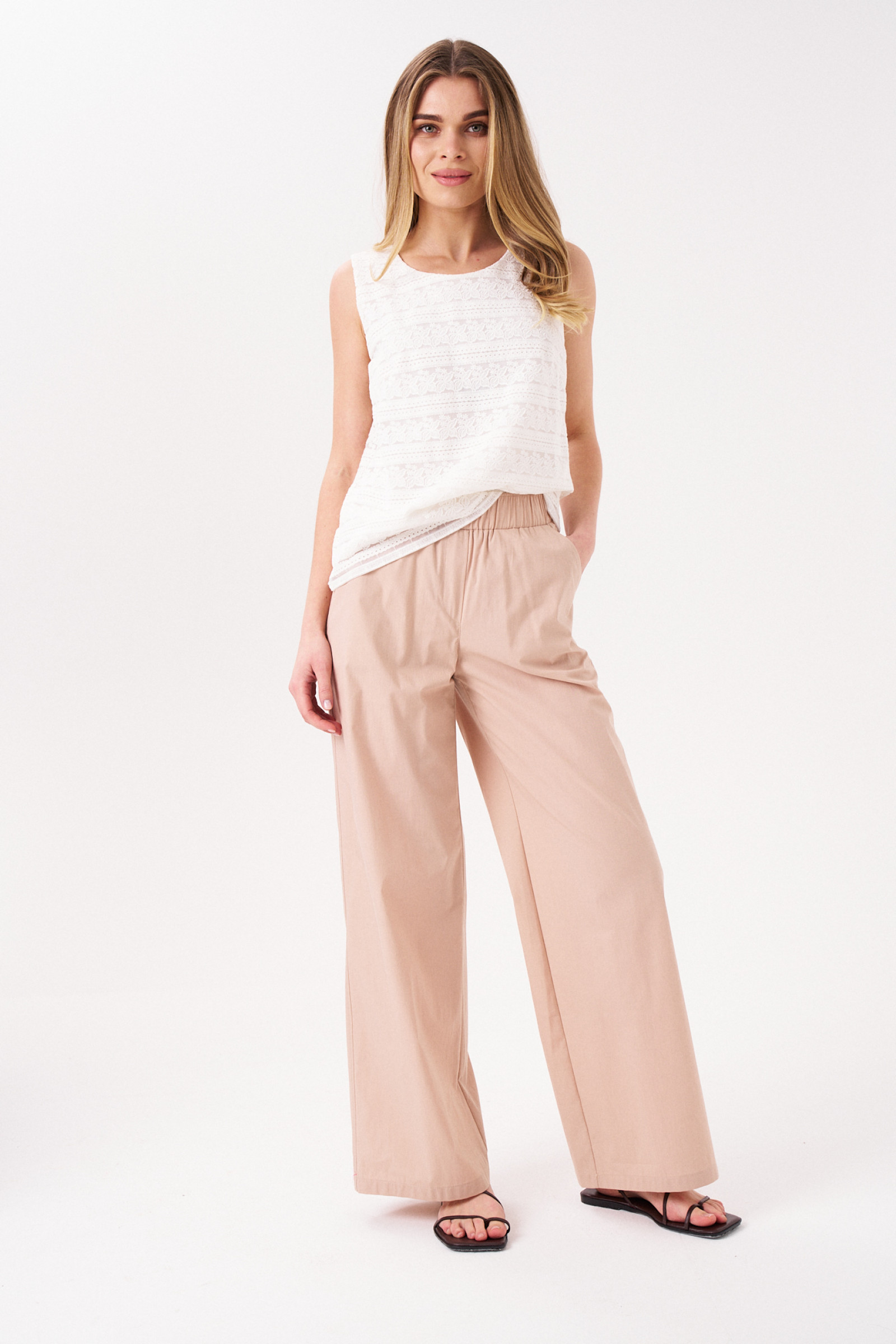 Брюки женские из хлопковой ткани для повседневной носки. Брюки прямого силуэта на поясе. Пояс на резинке, в боковых швах прорезные карманы. Длина брюк классическая.