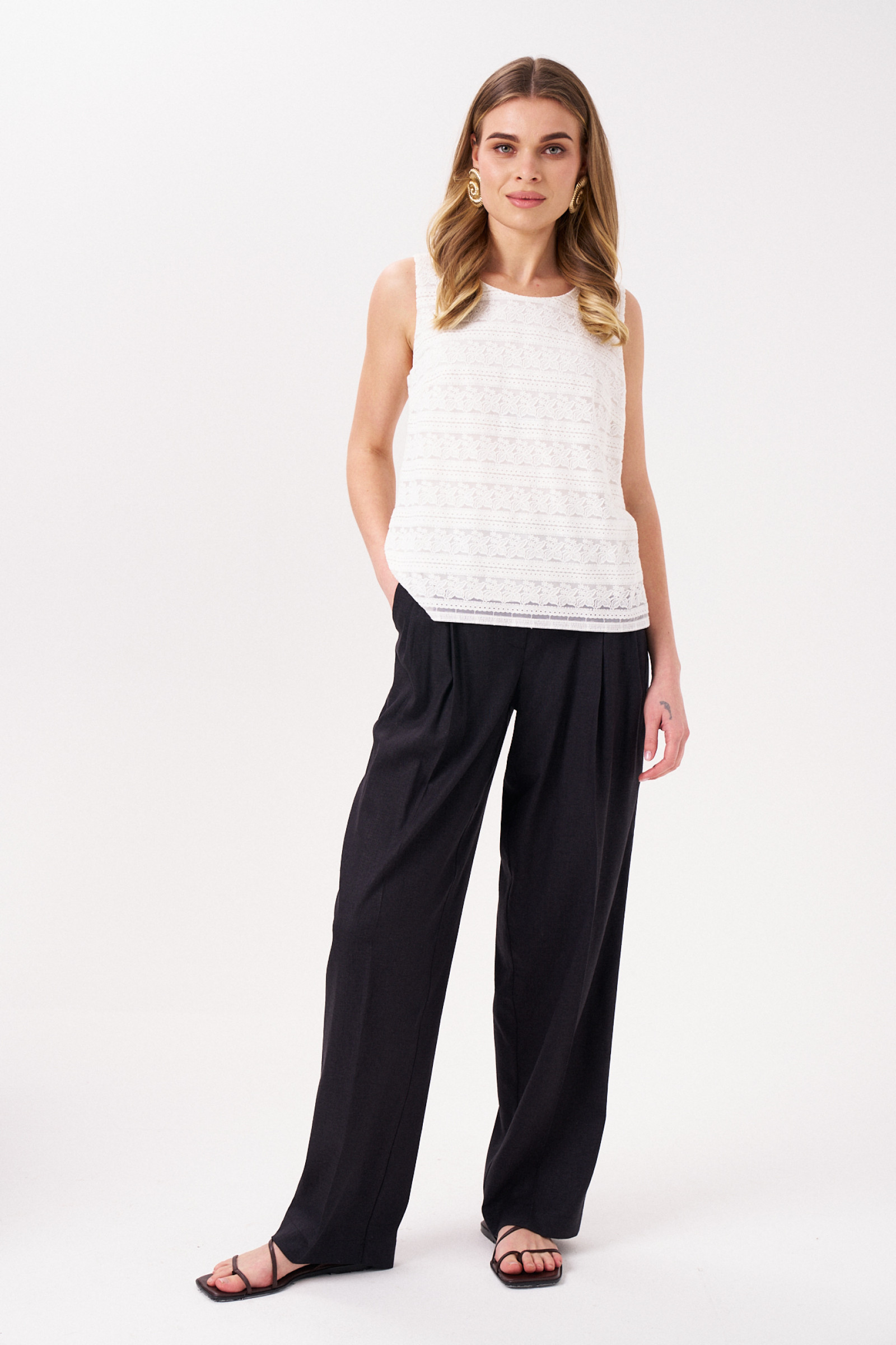 Брюки женские из вискозной ткаи с добавлением льна для повседневной носки. Изделие прямого силуэта на поясе. Есть шлевки. По переду защипы. В боковых швах прорезные карманы. Длина изделия классическая.